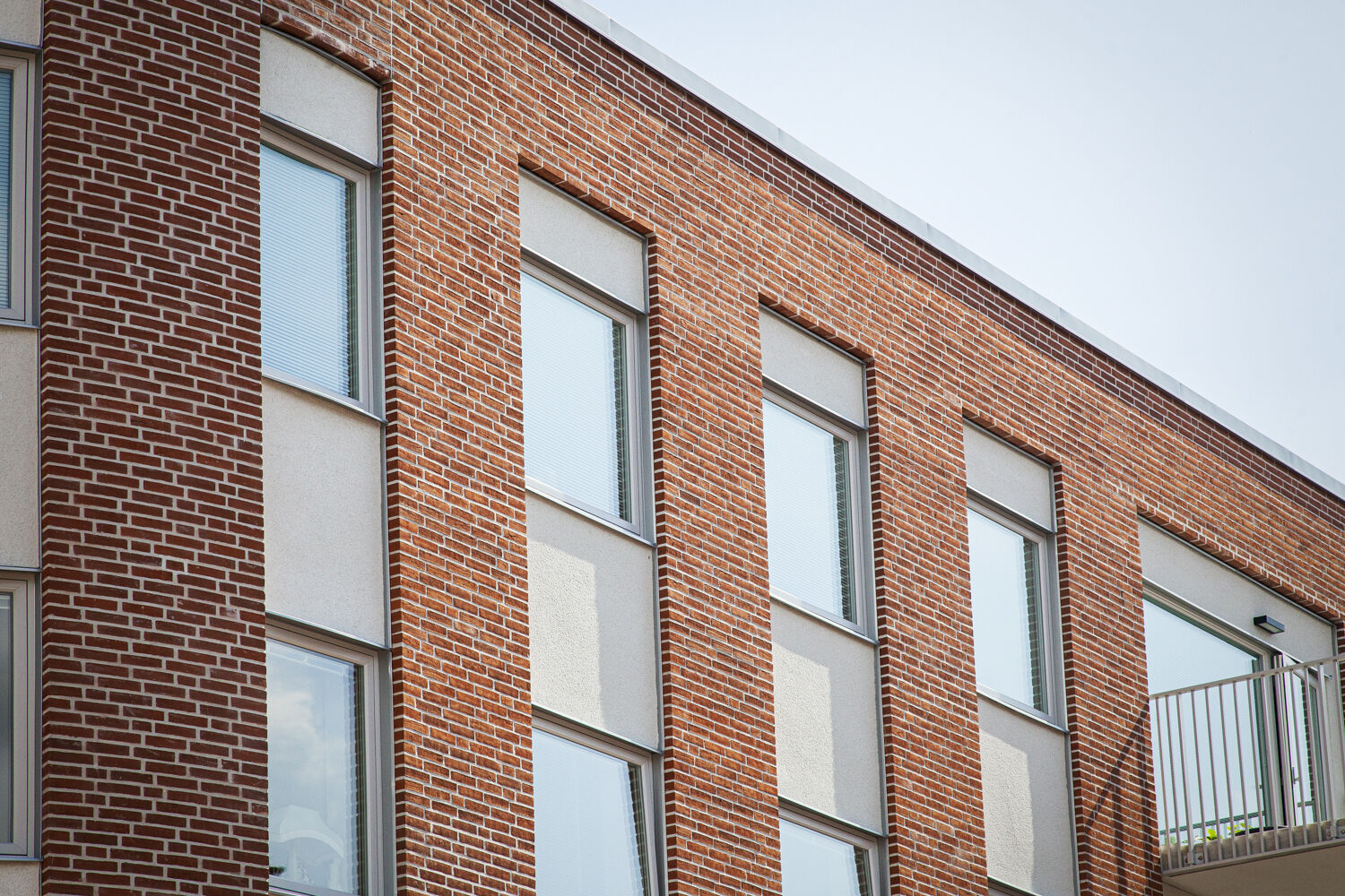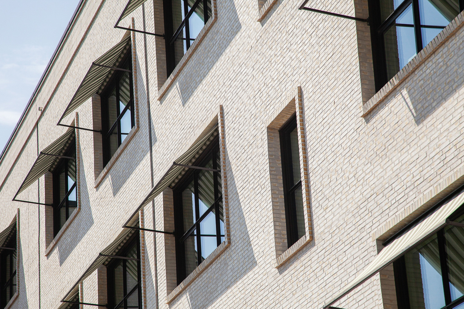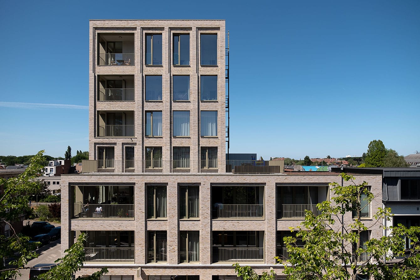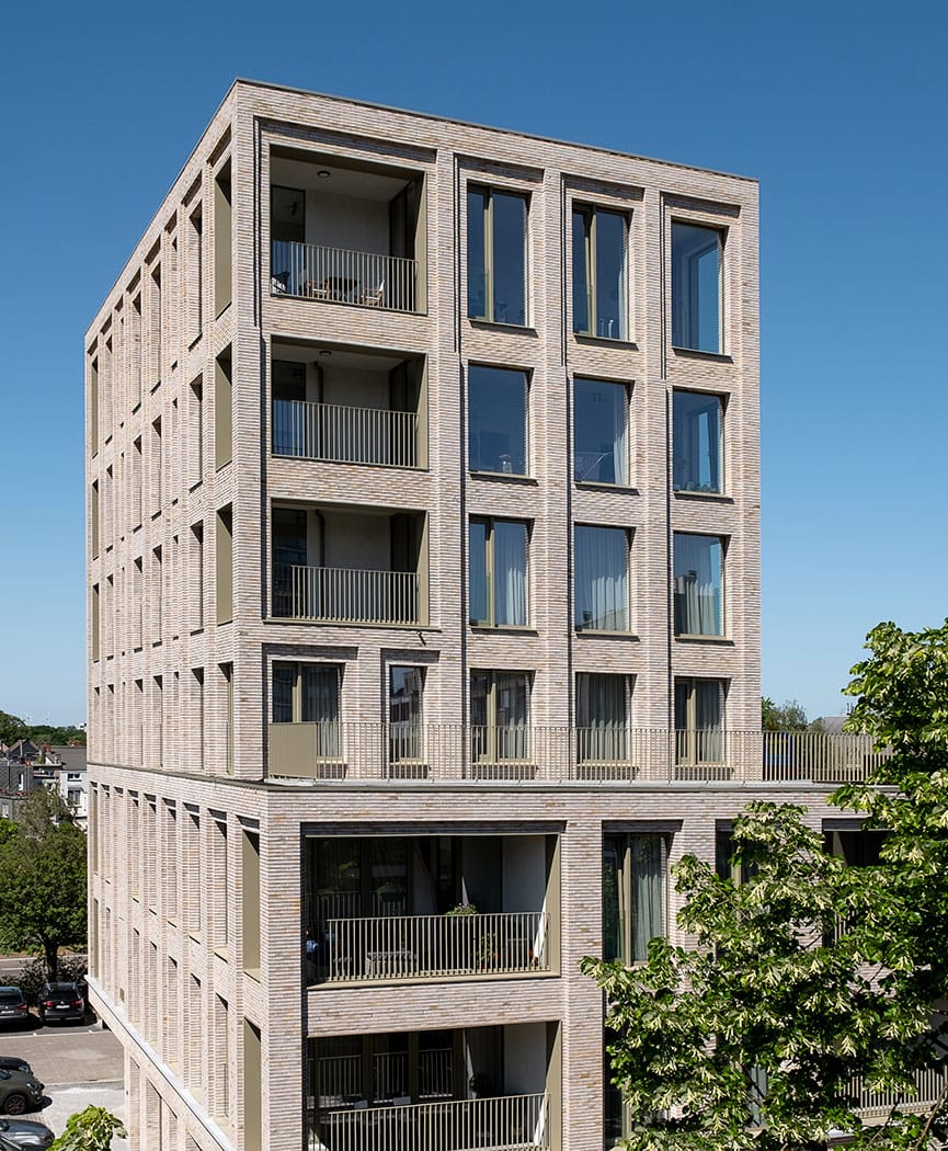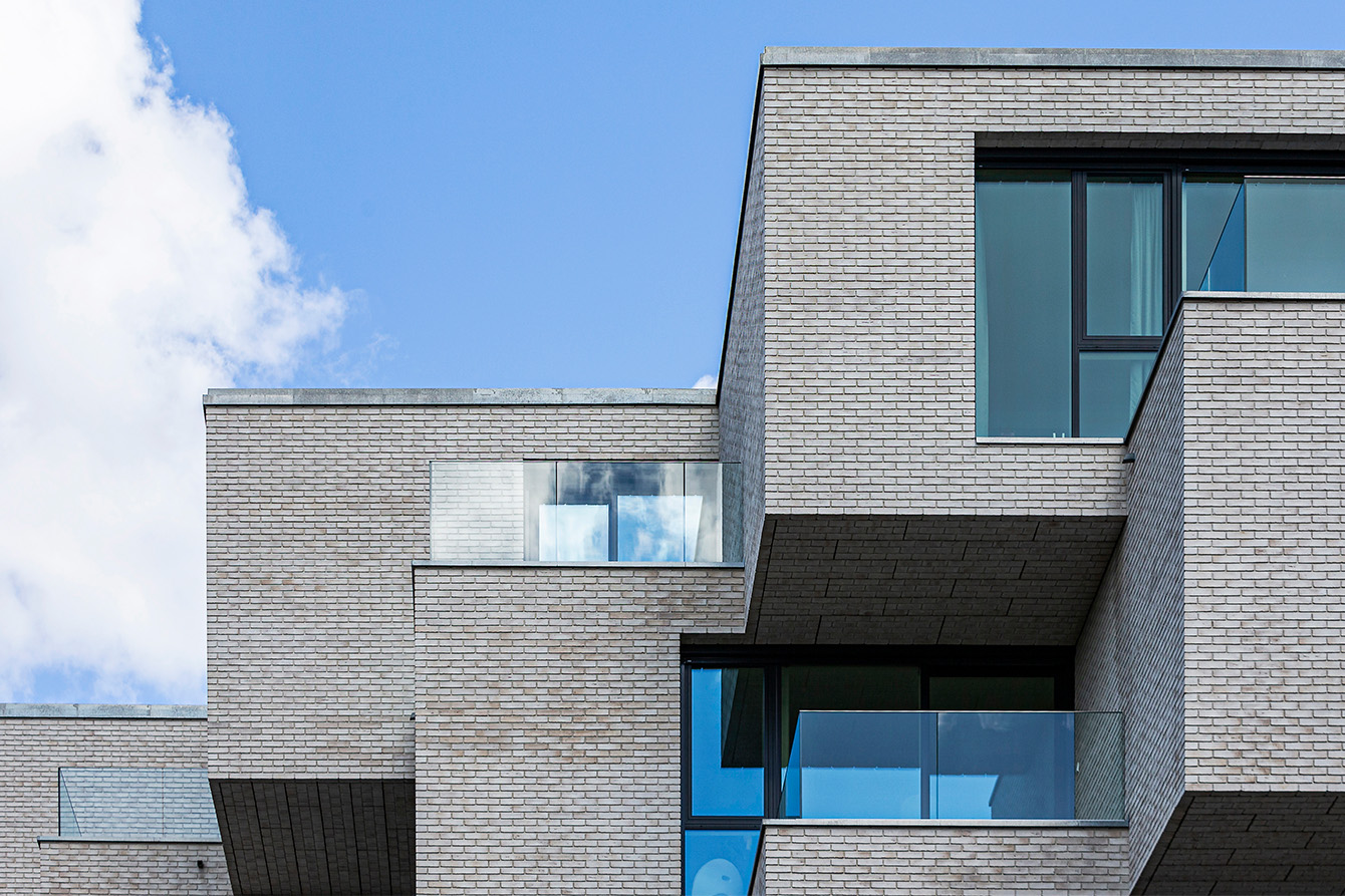 Exclusive apartment building with generous balconies overlooking a collective courtyard. Prima Lucca-bricks give this facade a fresh and modern look with shades of off-white and light-tinted yellow.