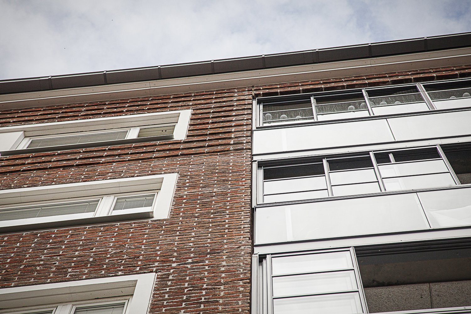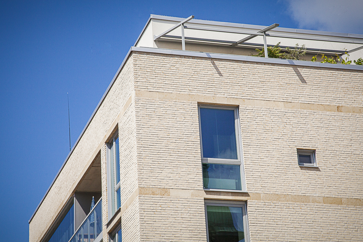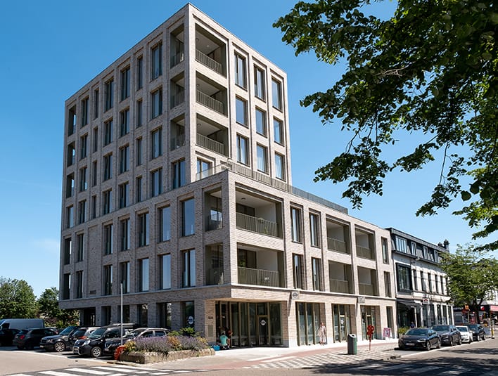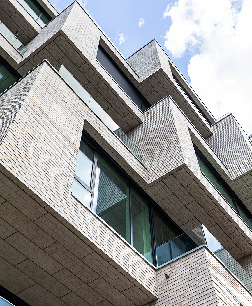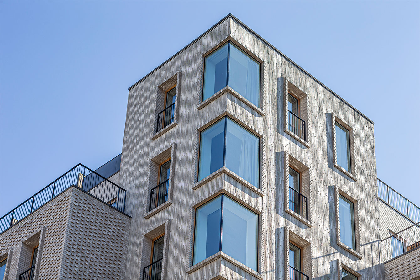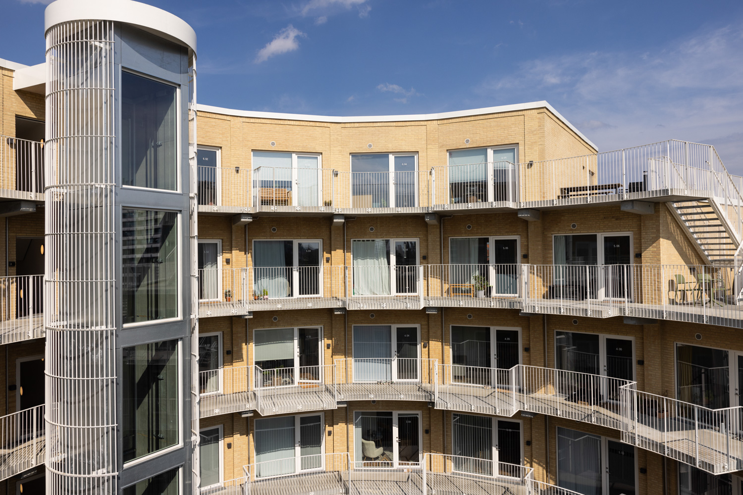 Exclusive apartment building with generous balconies overlooking a collective courtyard. Prima Lucca-bricks give this facade a fresh and modern look with shades of off-white and light-tinted yellow.