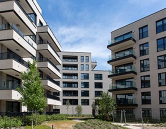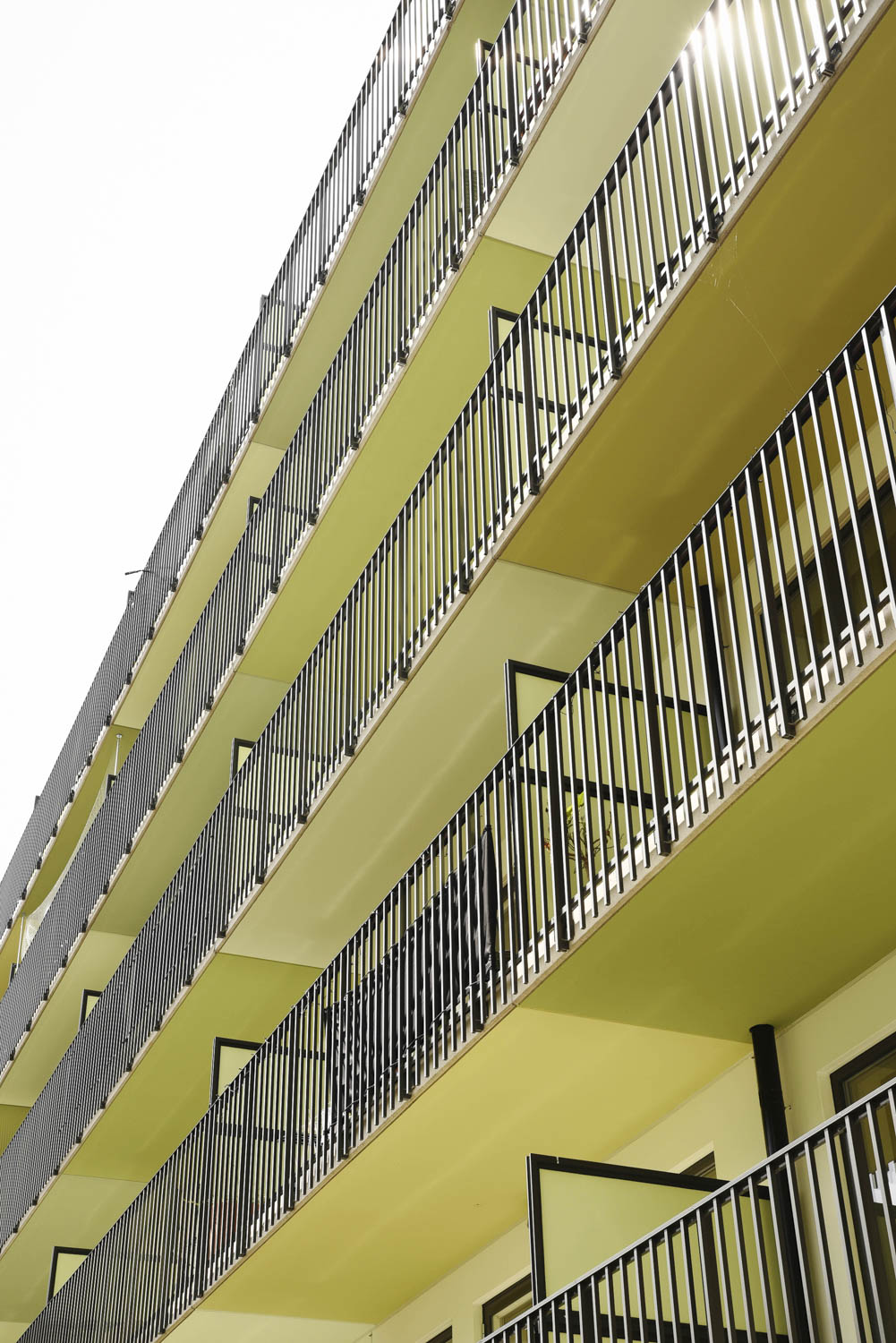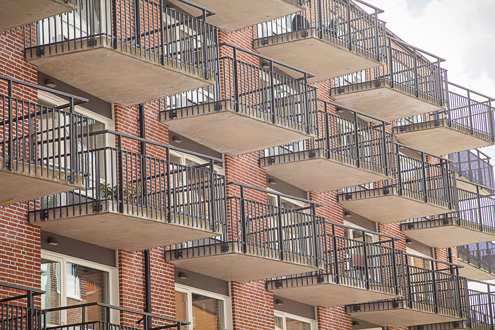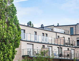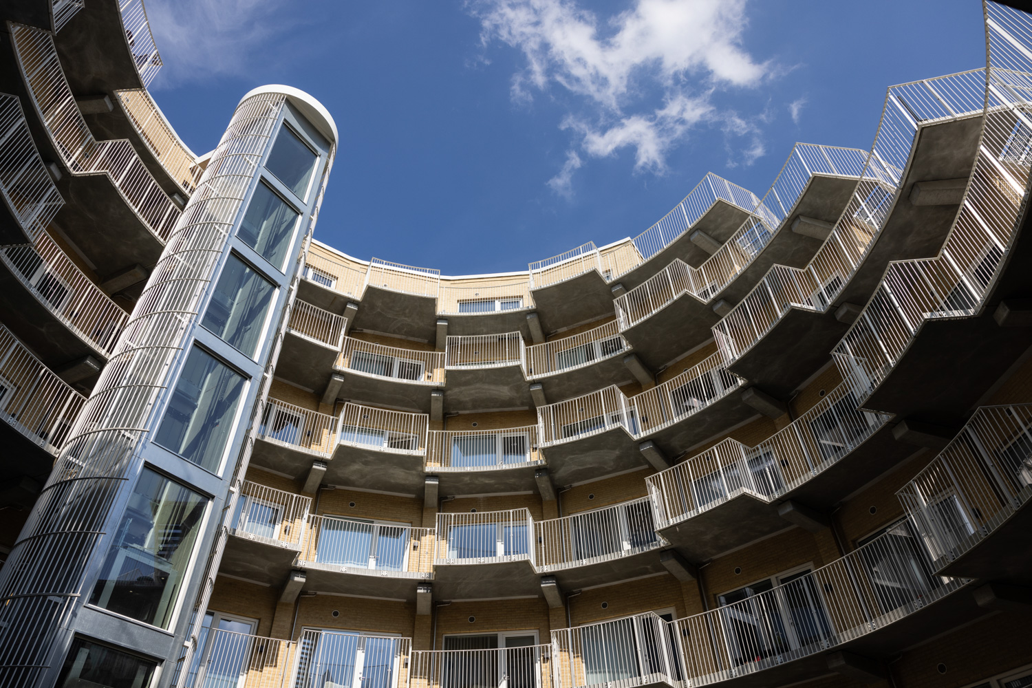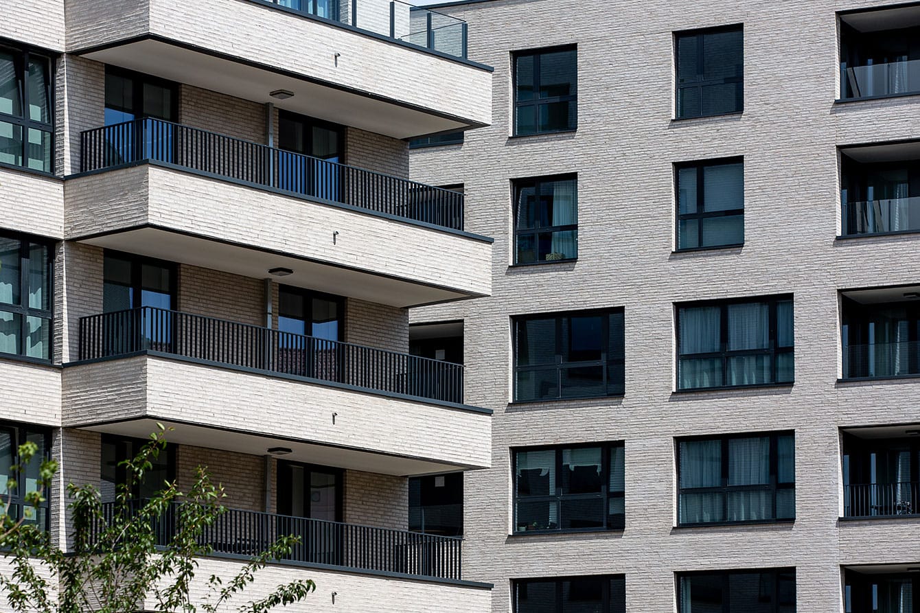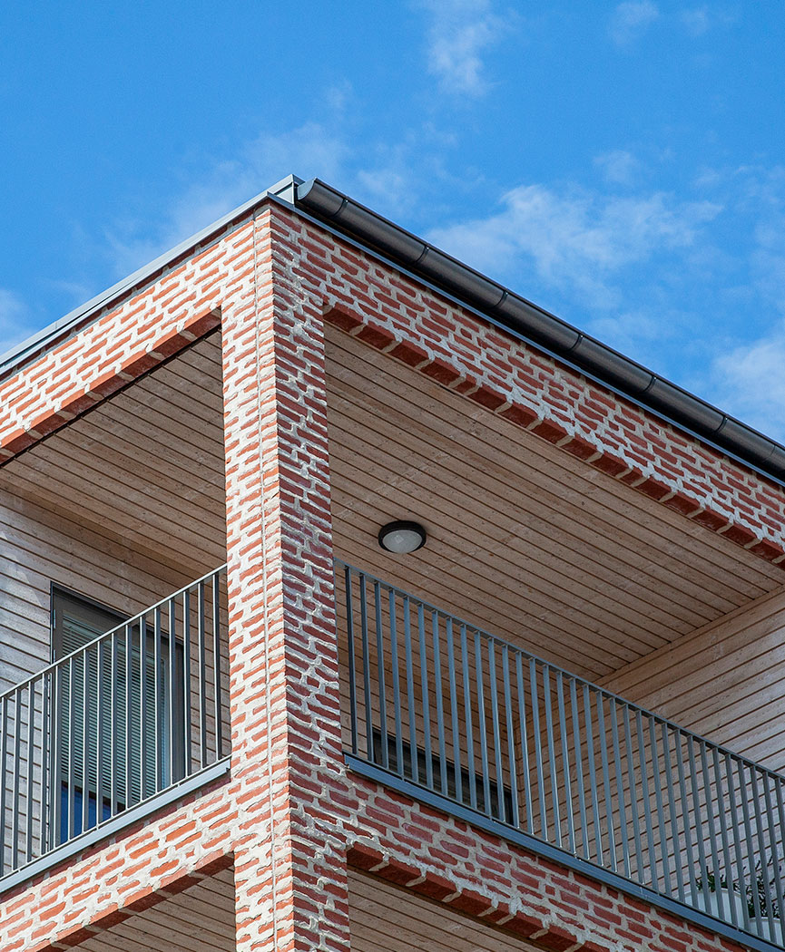 Exclusive apartment building with generous balconies overlooking a collective courtyard. Prima Lucca-bricks give this facade a fresh and modern look with shades of off-white and light-tinted yellow.