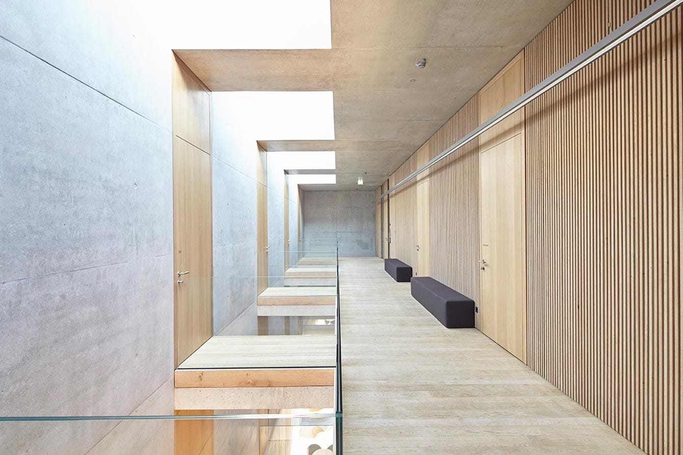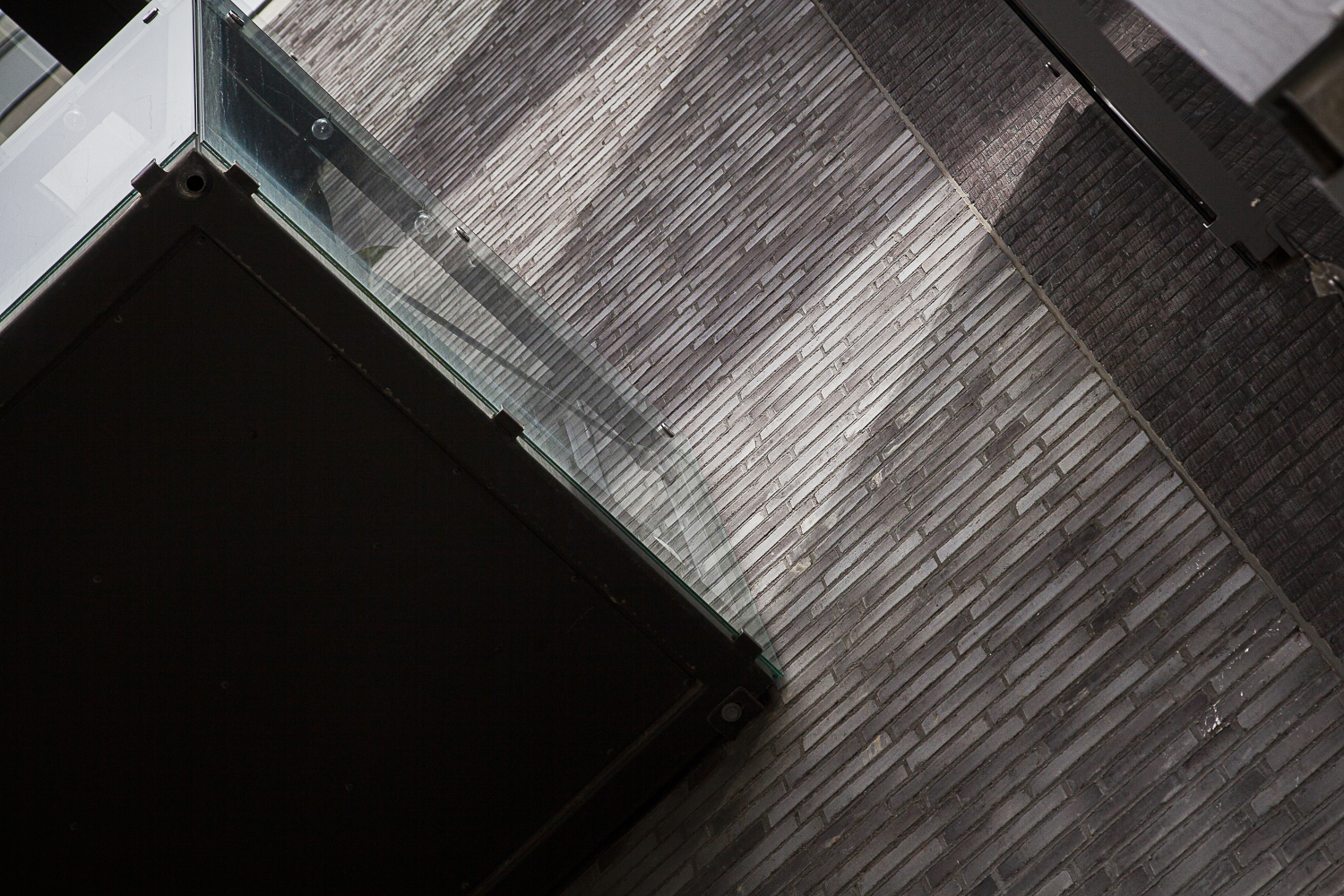 The tile façade is done in full height, ie. all weight is brought down to the foundation. The displaced window positions result in increased loads on the brick beams as the load is brought down to the foundation, and thus up to 17 shift high prefabricated tile beams are made to support the construction. The meeting boxes are suspended in a bearing steel structure with suspended bricklifts along the underside of the boxes. The thickness of the tile ceilings is just 35 mm. to achieve a minimalist expression.