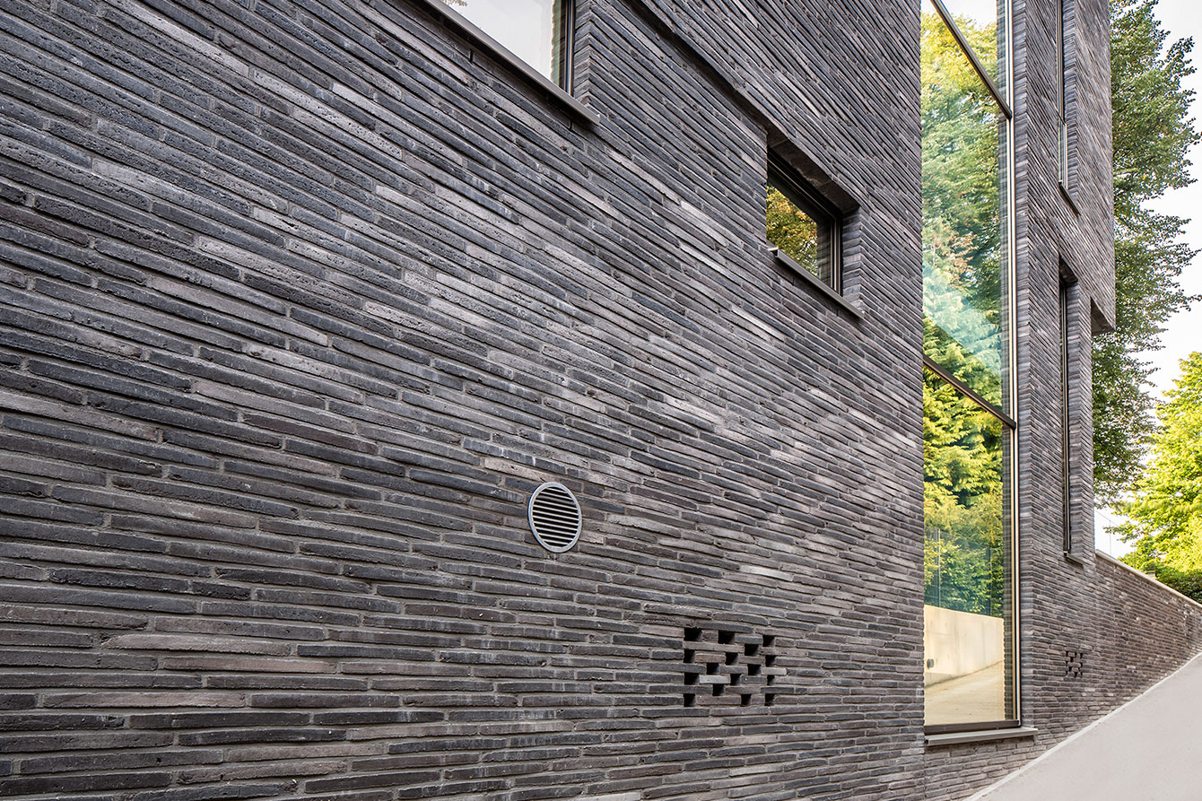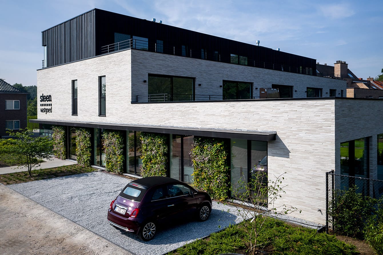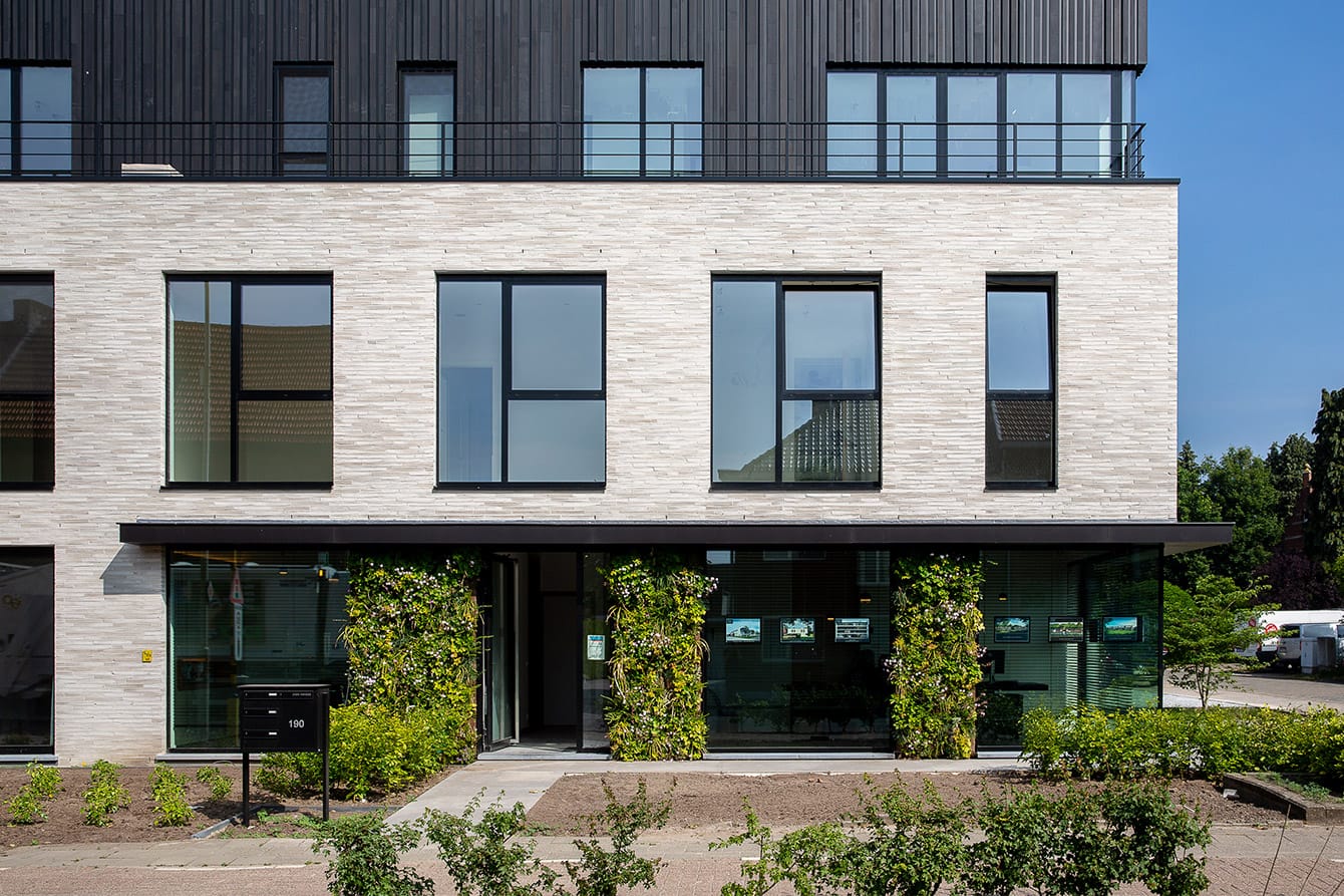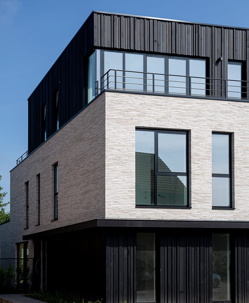 By combining an open ground plan with floor-to-ceiling windows and flowering green walls, this Belgian complex combines business and residence with urban leisure. Separated floor plans create balconies and a nice variation between black wood sections and bright bricks. Here, the Ultima RT 154 creates a delightful contrast to the deep blacks.