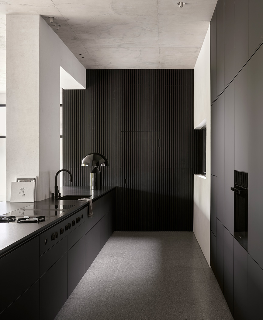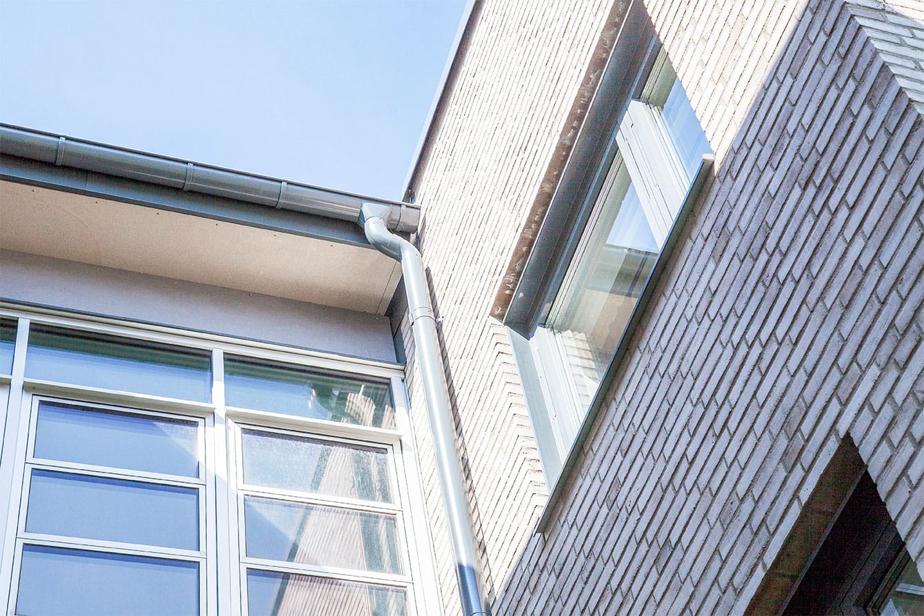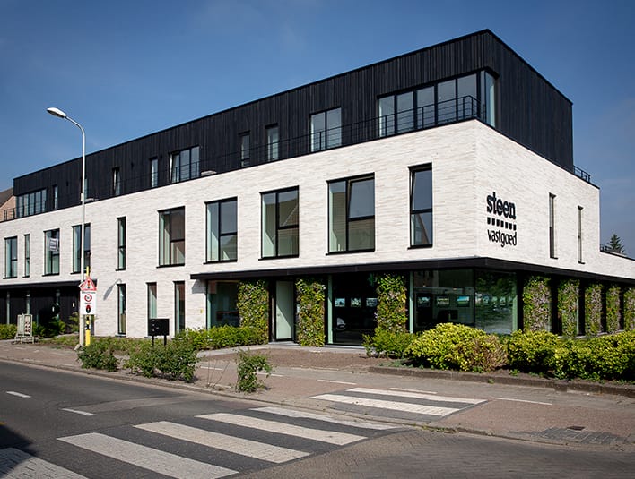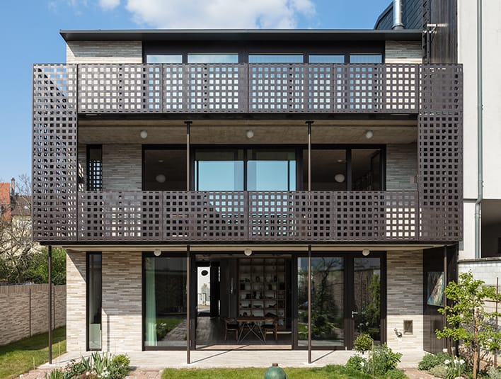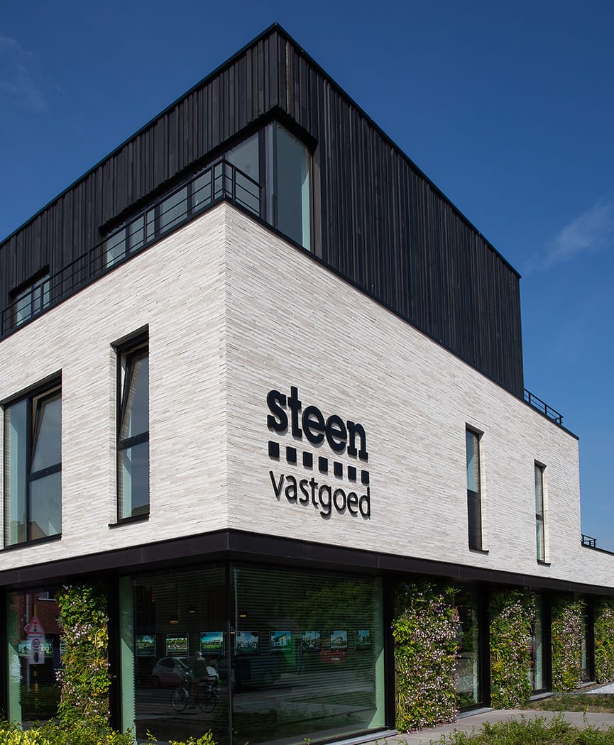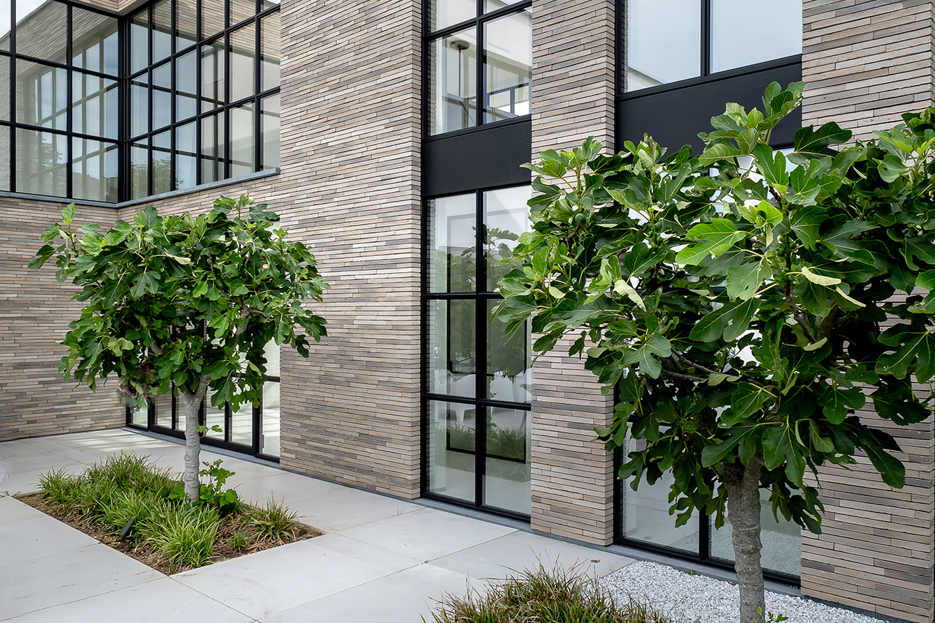 By combining an open ground plan with floor-to-ceiling windows and flowering green walls, this Belgian complex combines business and residence with urban leisure. Separated floor plans create balconies and a nice variation between black wood sections and bright bricks. Here, the Ultima RT 154 creates a delightful contrast to the deep blacks.
