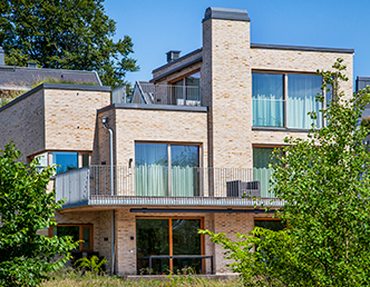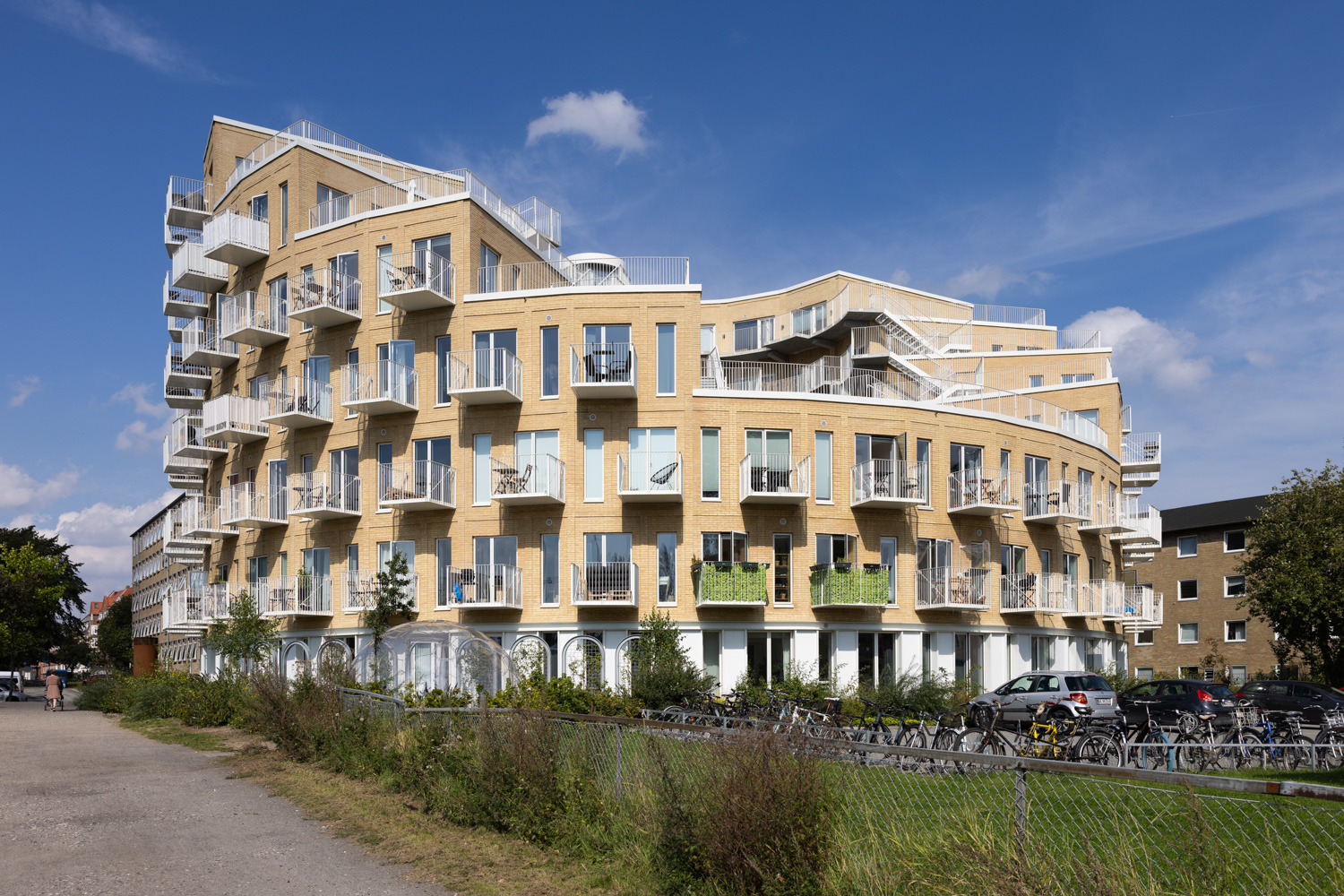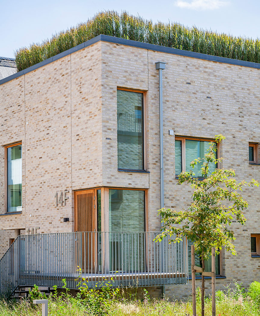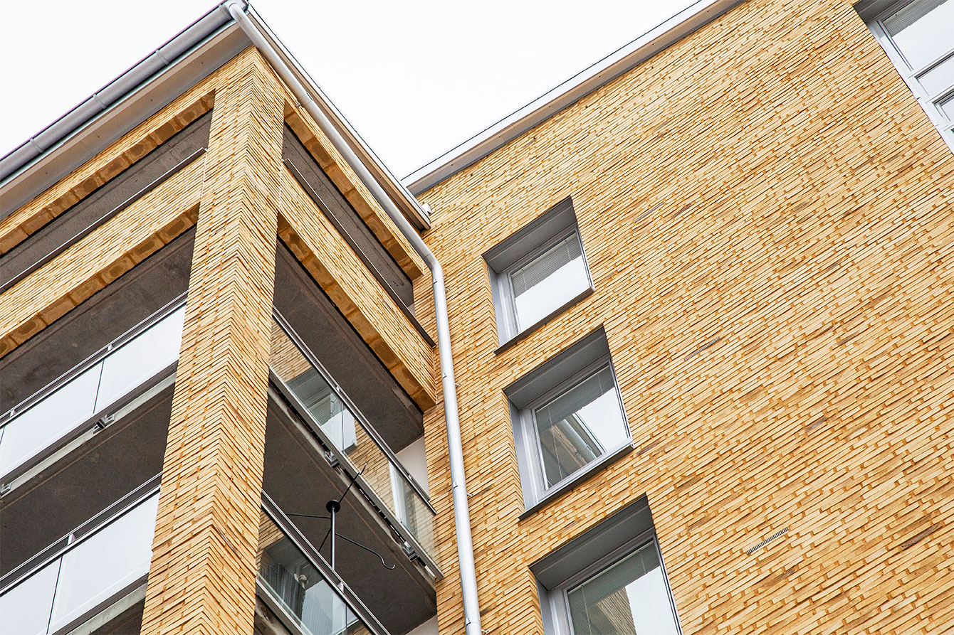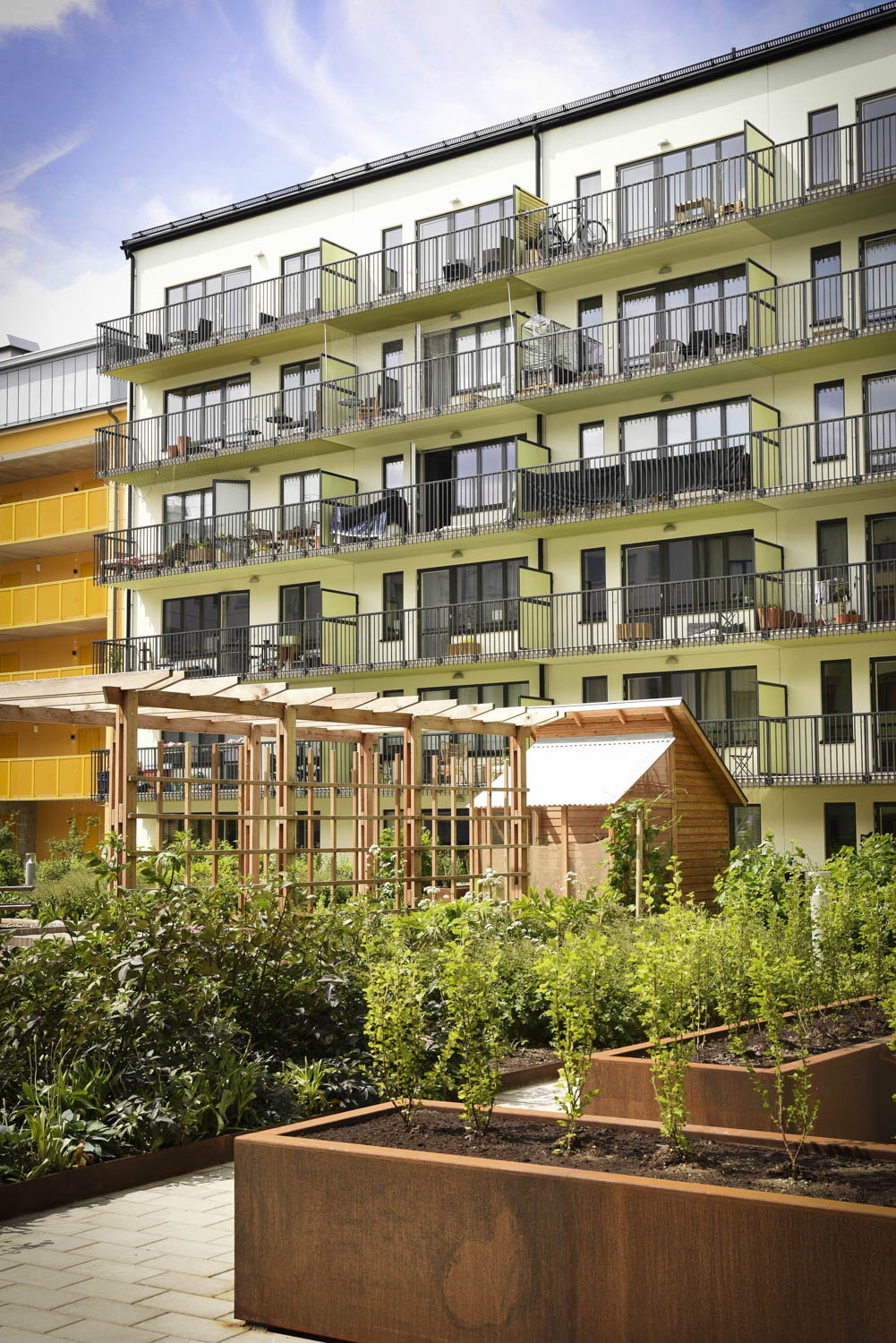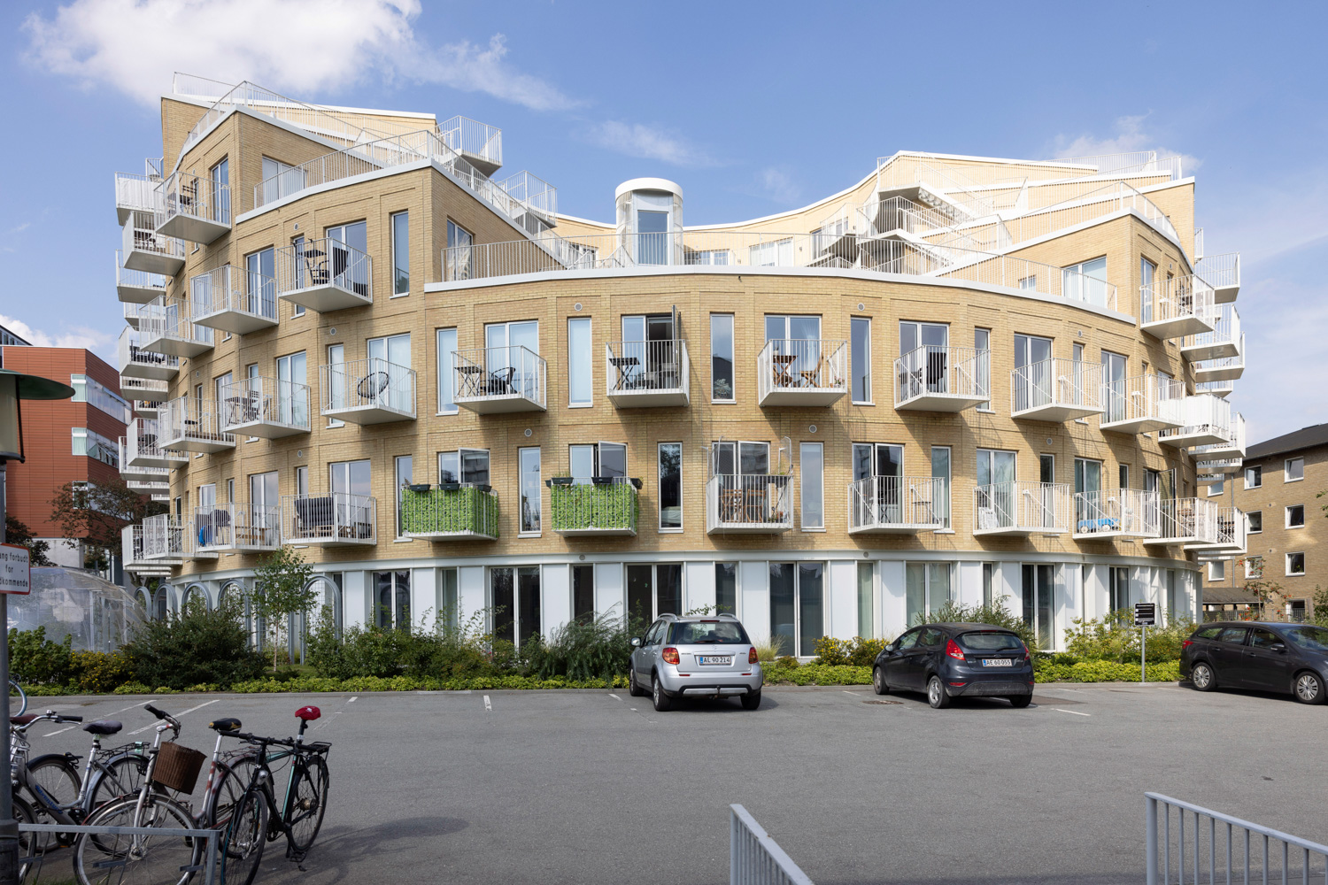 A lovely apartment house that dwells together in harmony with the surrounding greens and common gardens. Bright yellow brick colours, beautiful wooden details and roof gardens create an appealing and relaxing atmosphere.