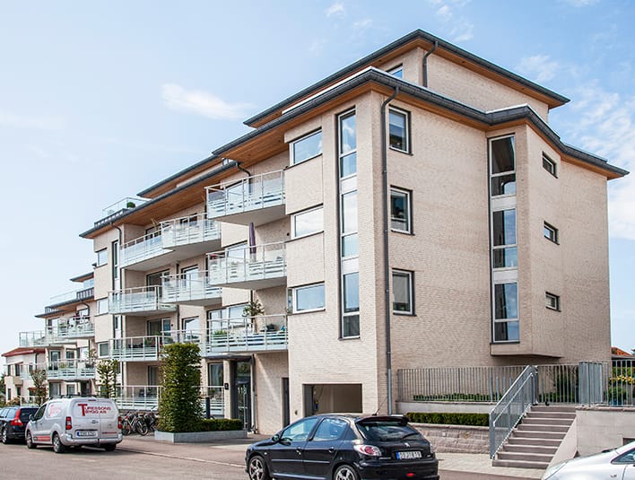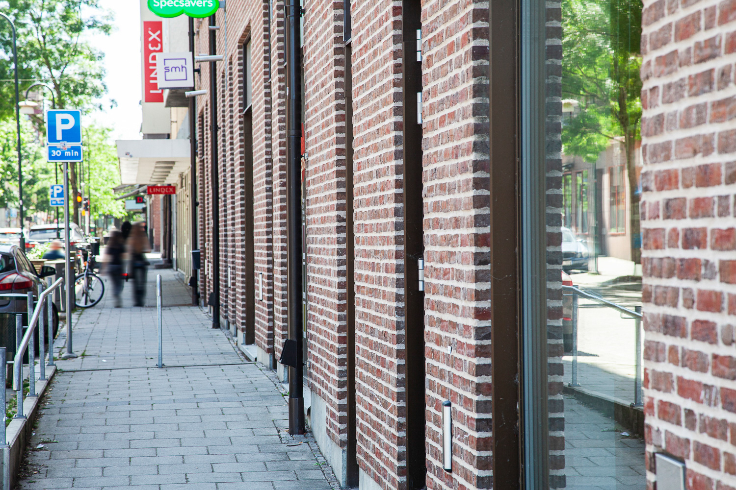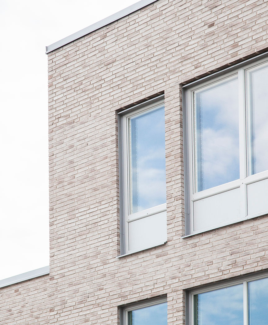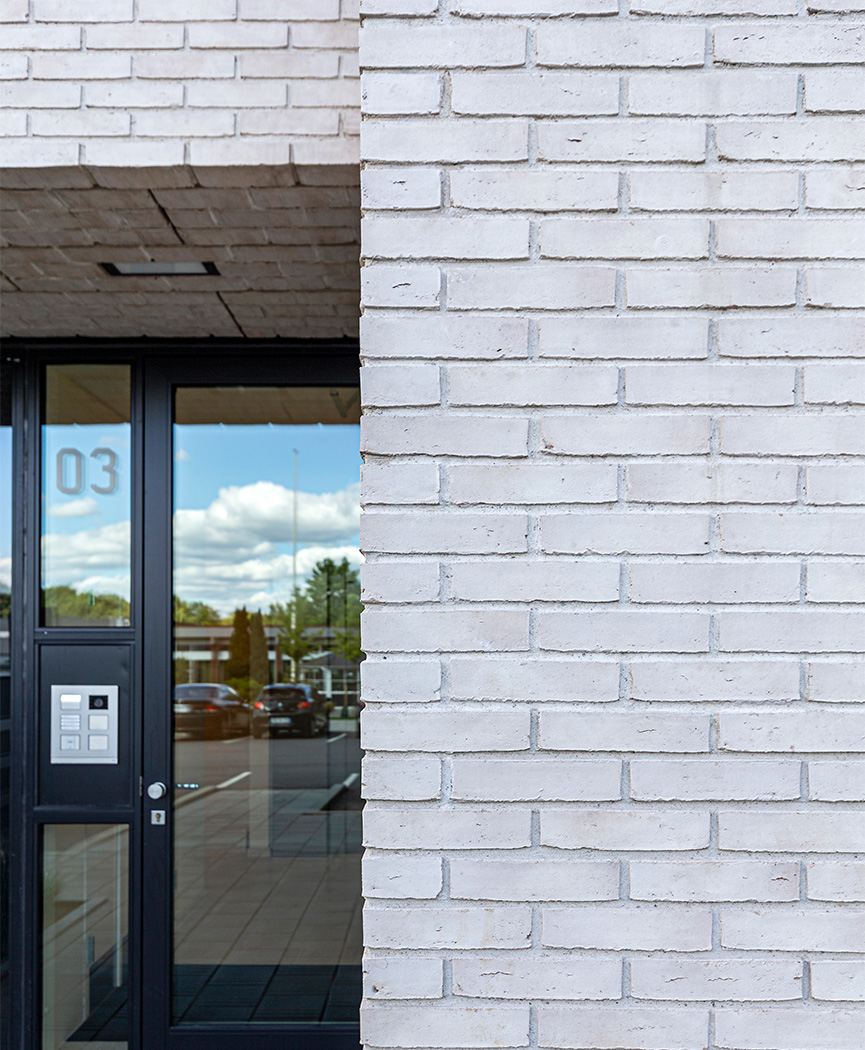 This timeless look in the centre of Täby has a minimalistic and classy look. The building’s squared form and straight lines work fine with bright coloured bricks, that have a slight variation in the final masonry.
