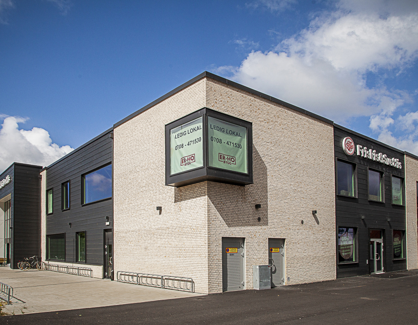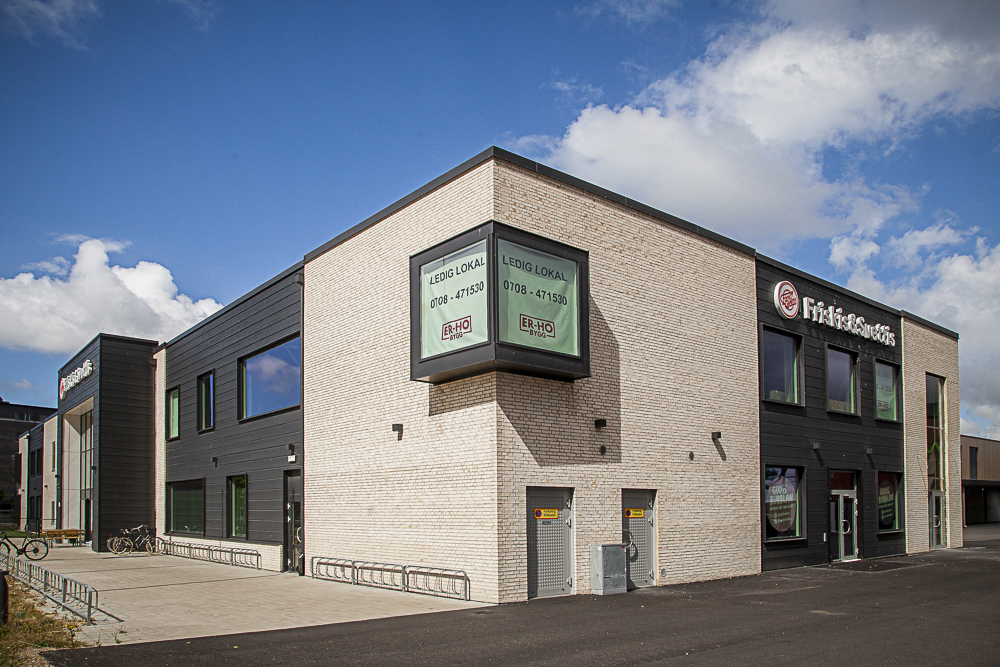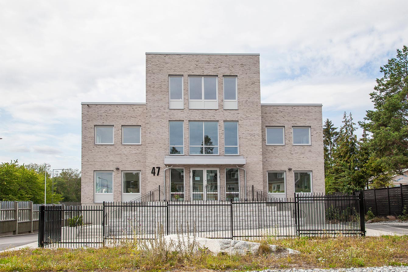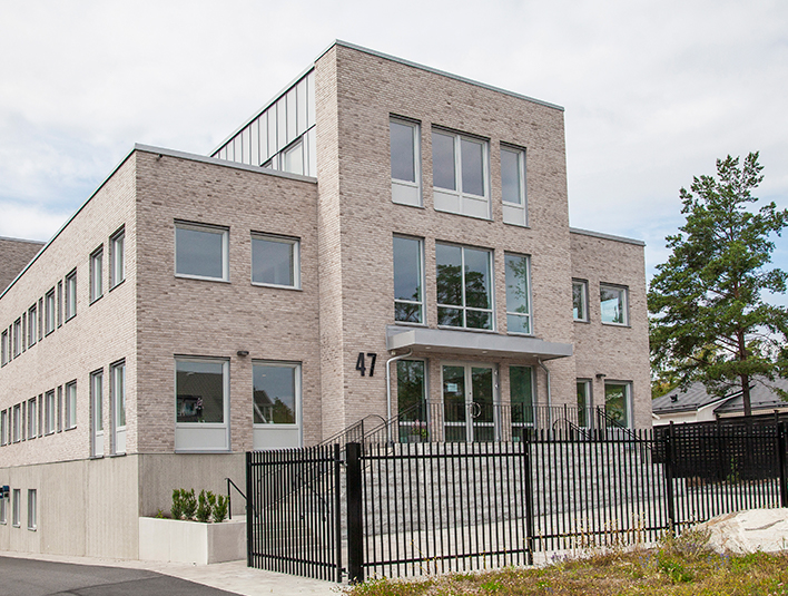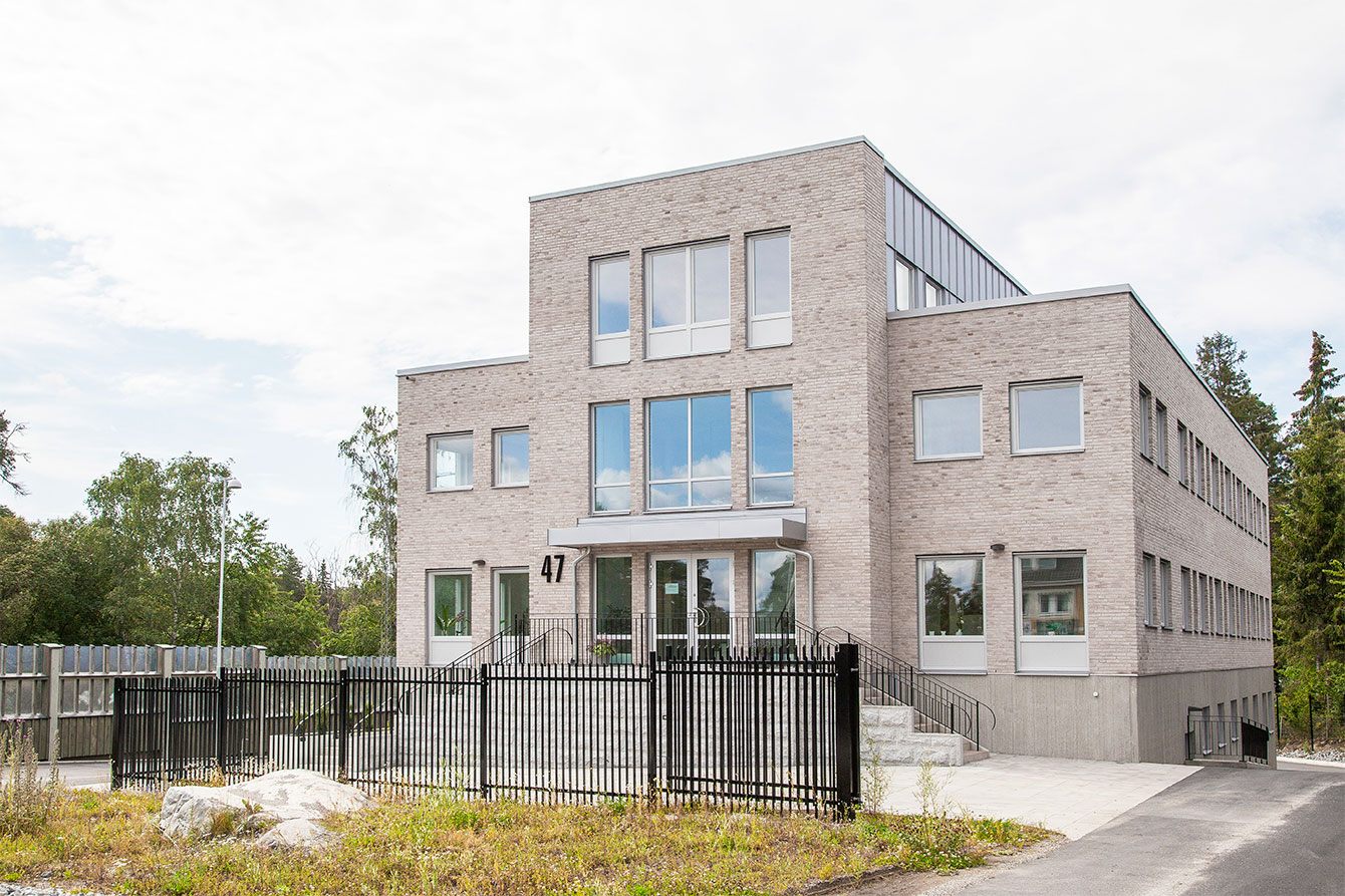 This timeless look in the centre of Täby has a minimalistic and classy look. The building’s squared form and straight lines work fine with bright coloured bricks, that have a slight variation in the final masonry.