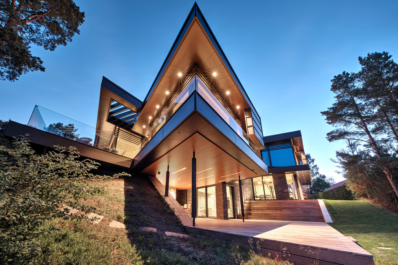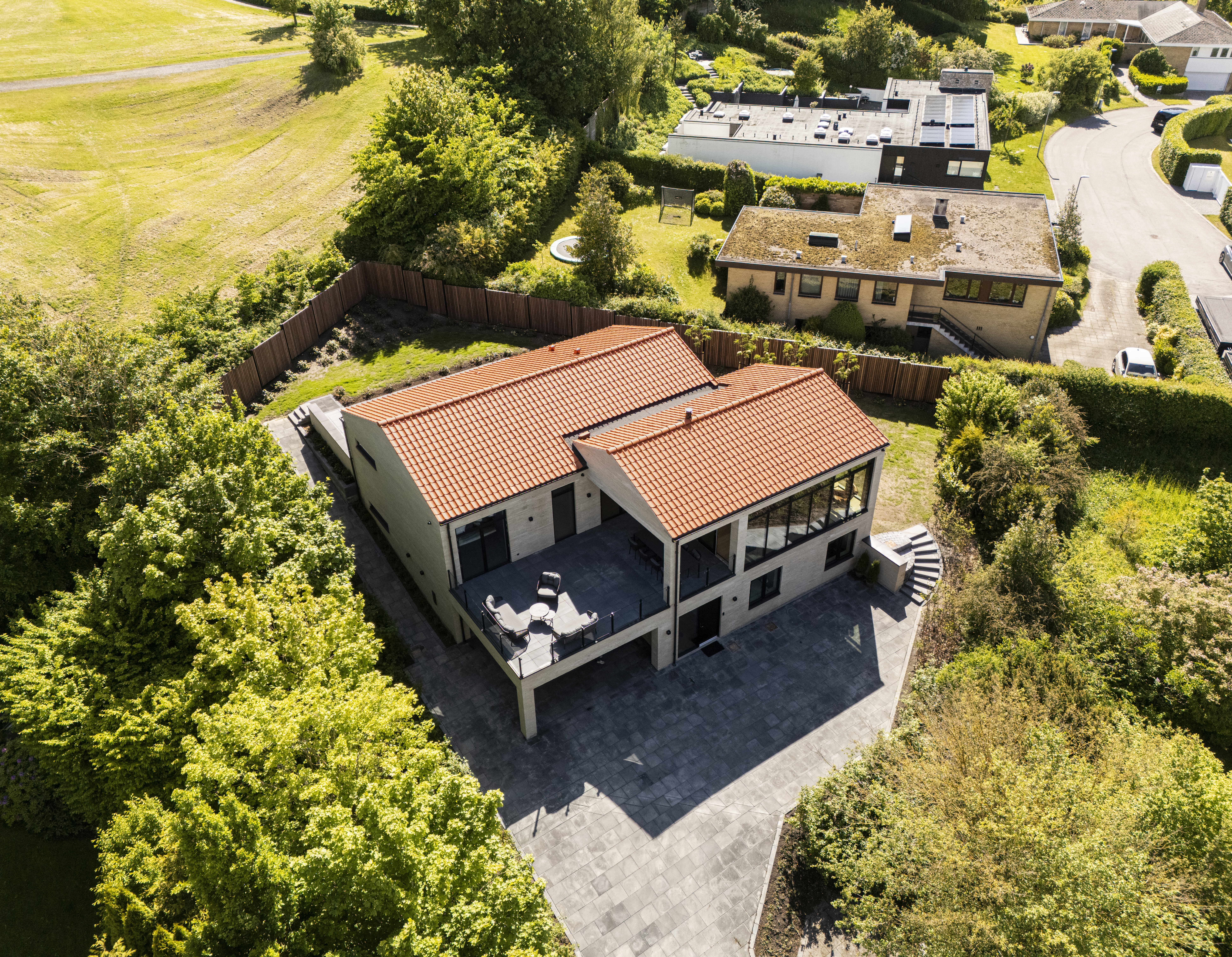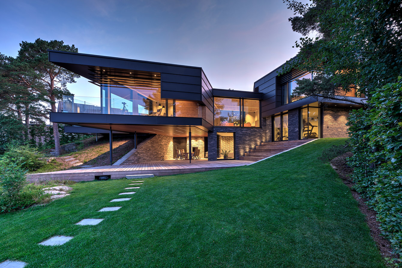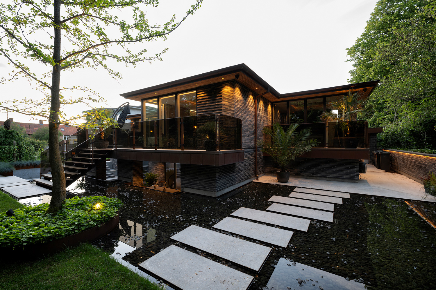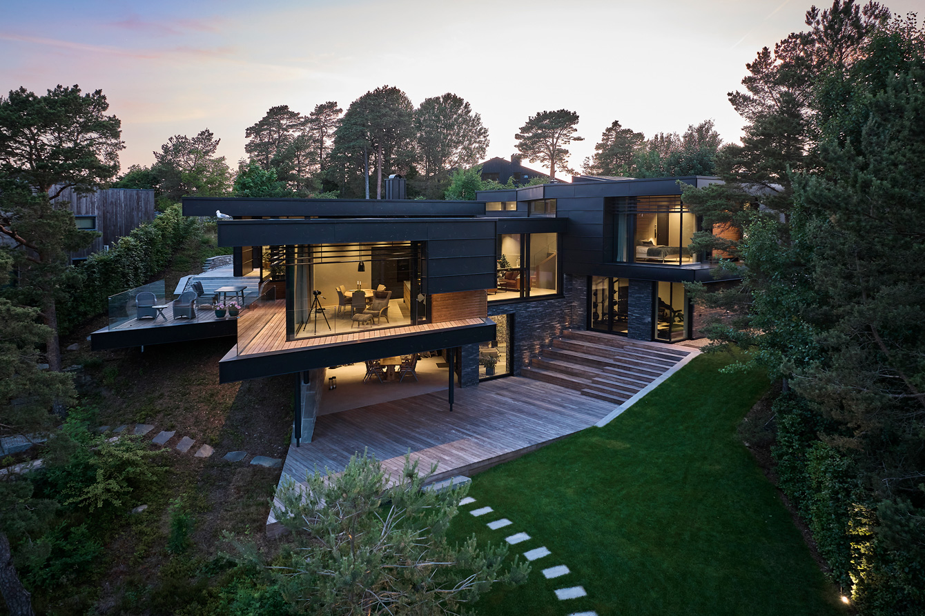 At the turn of a lush roundabout in an attractive neighbourhood, a businessman bought a large detached plot of land to fulfil a childhood dream: To create a world of his own in the woods. The vision for the project was to create as much discretion and privacy as possible without comprising the desire for a bright home with open and translucent rooms filled with daylight.