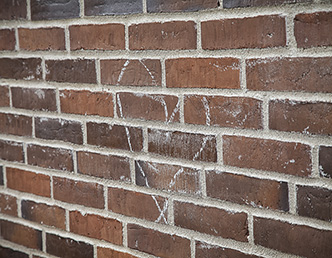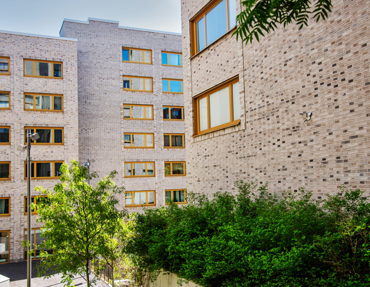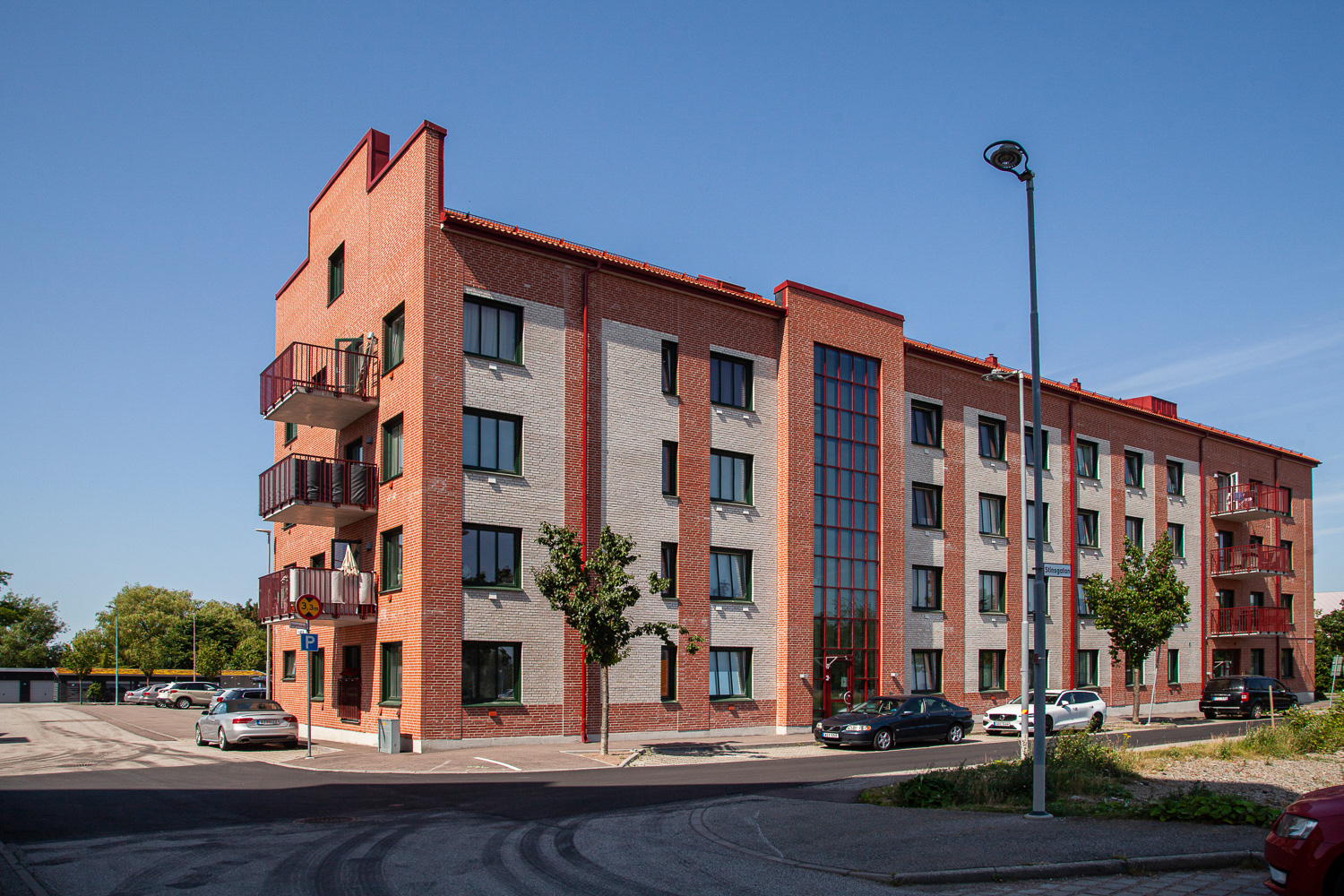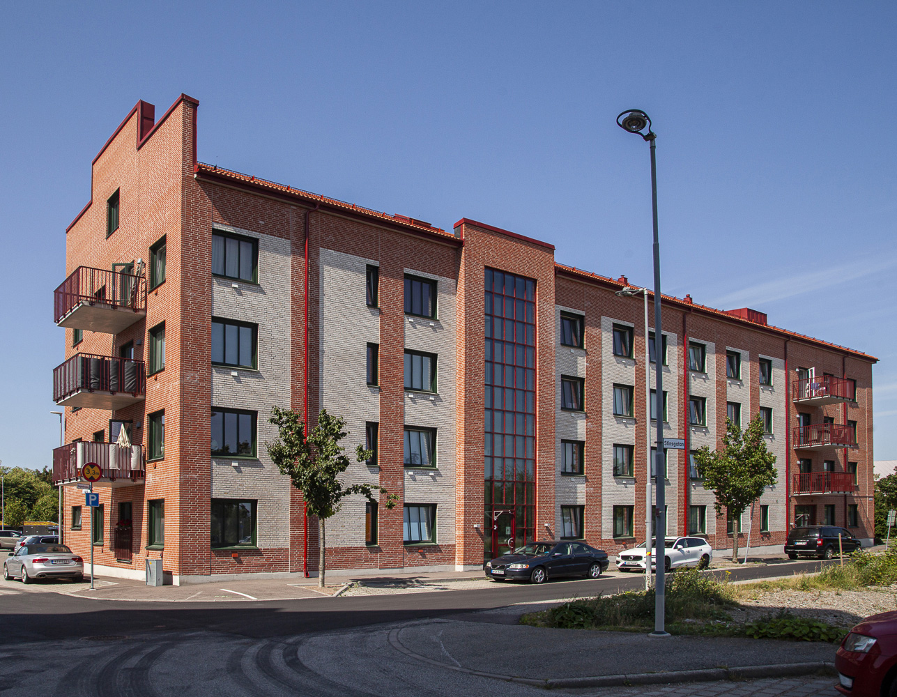 Kvarteret pryds av en generös tegelfasad som lockar betraktarens öga. Tre olika tegelfärger bryter av och delar in fasaden, vilket ger en varierad visuell upplevelse.