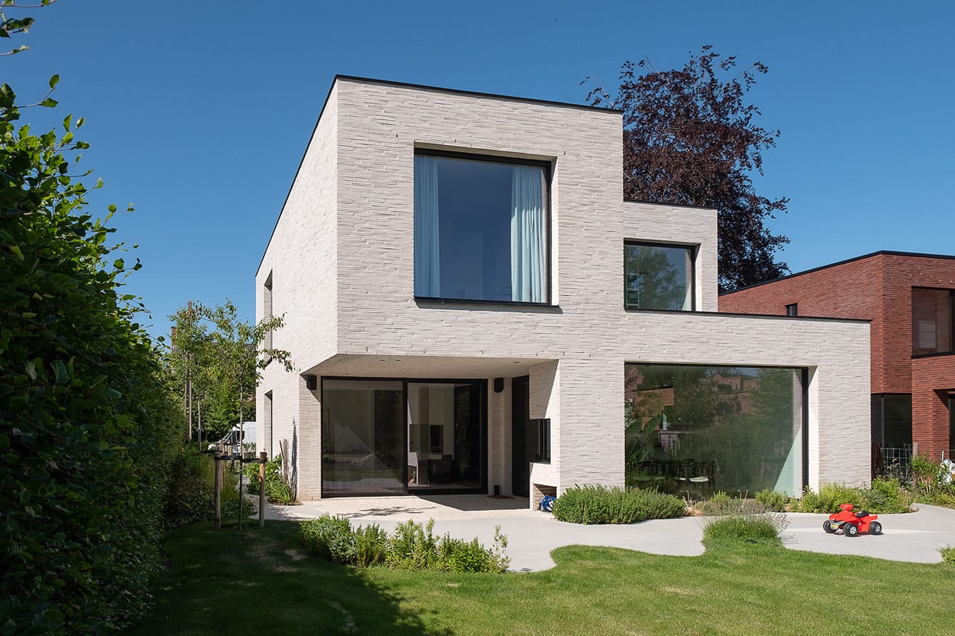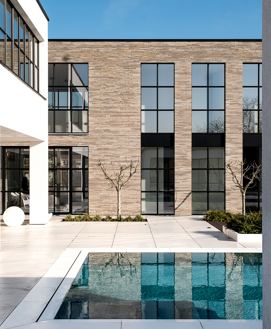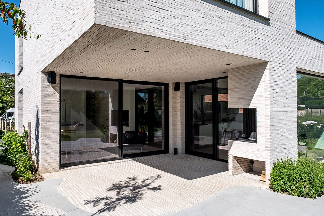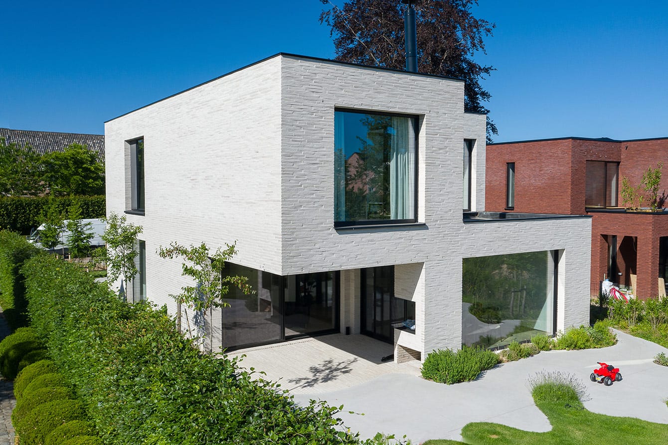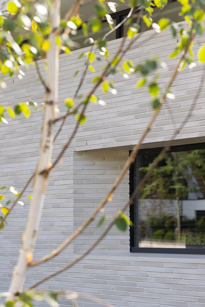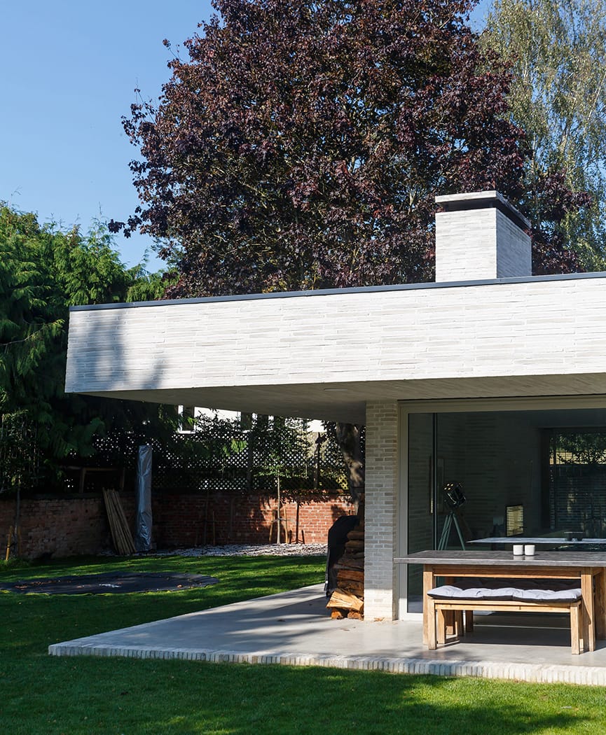 This Belgian villa is a bold statement of white vibes, that truly embodies the concept of a million shades of white. Armed with Ultima bricks in full white, the architect has created relaxing spaces below brick overhangs, luxurious blends of black and white and brick flooring.