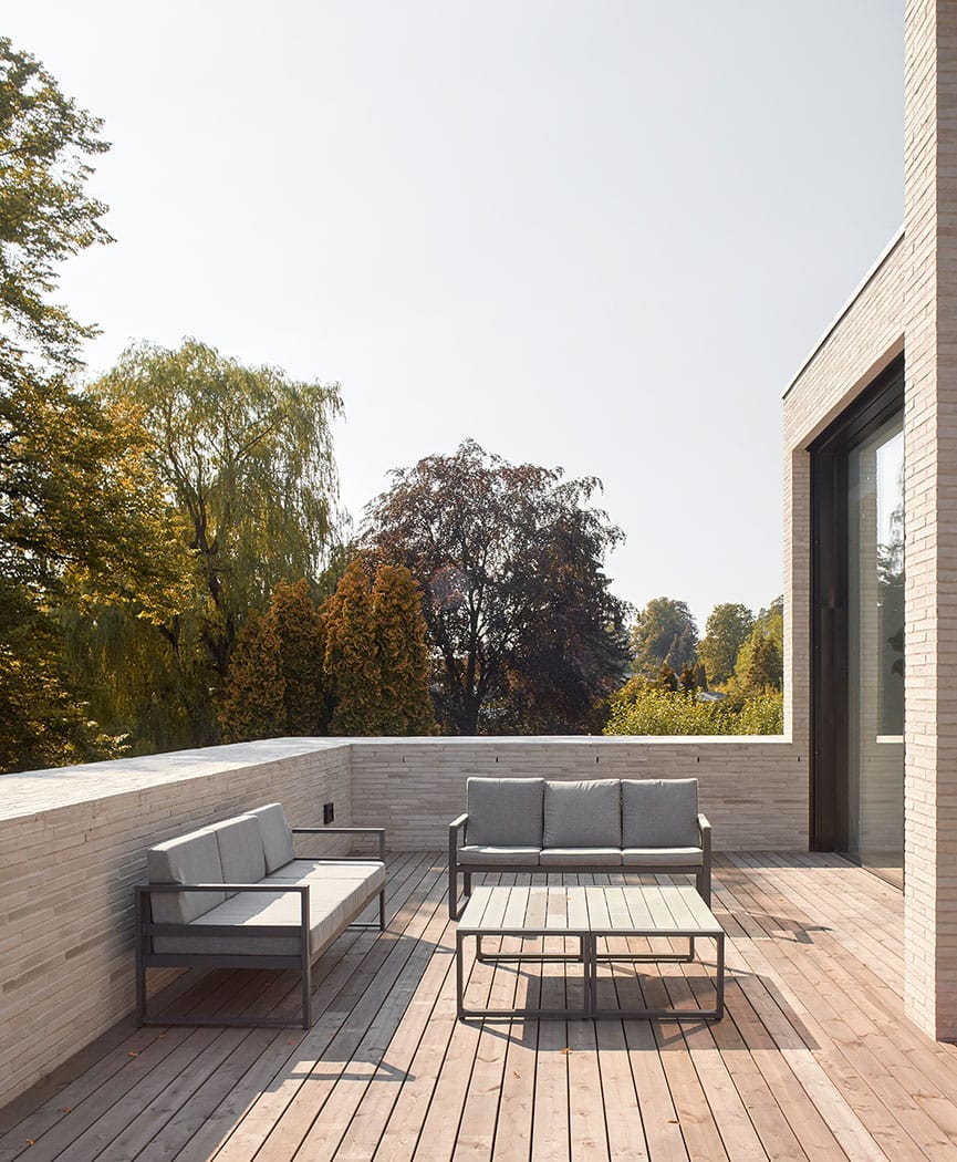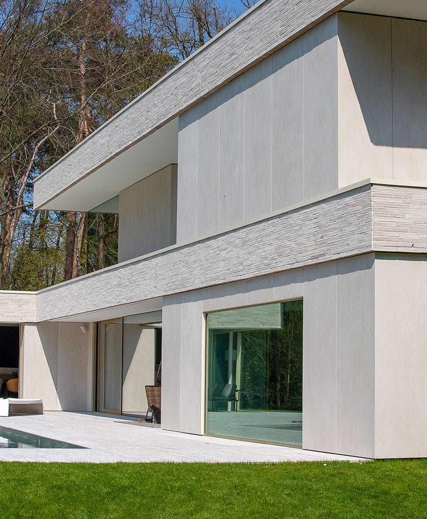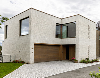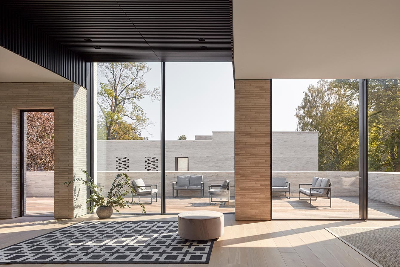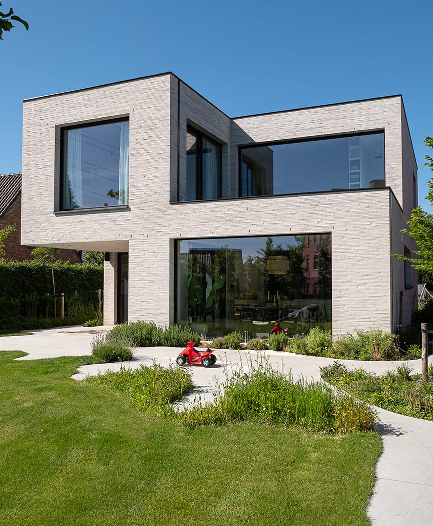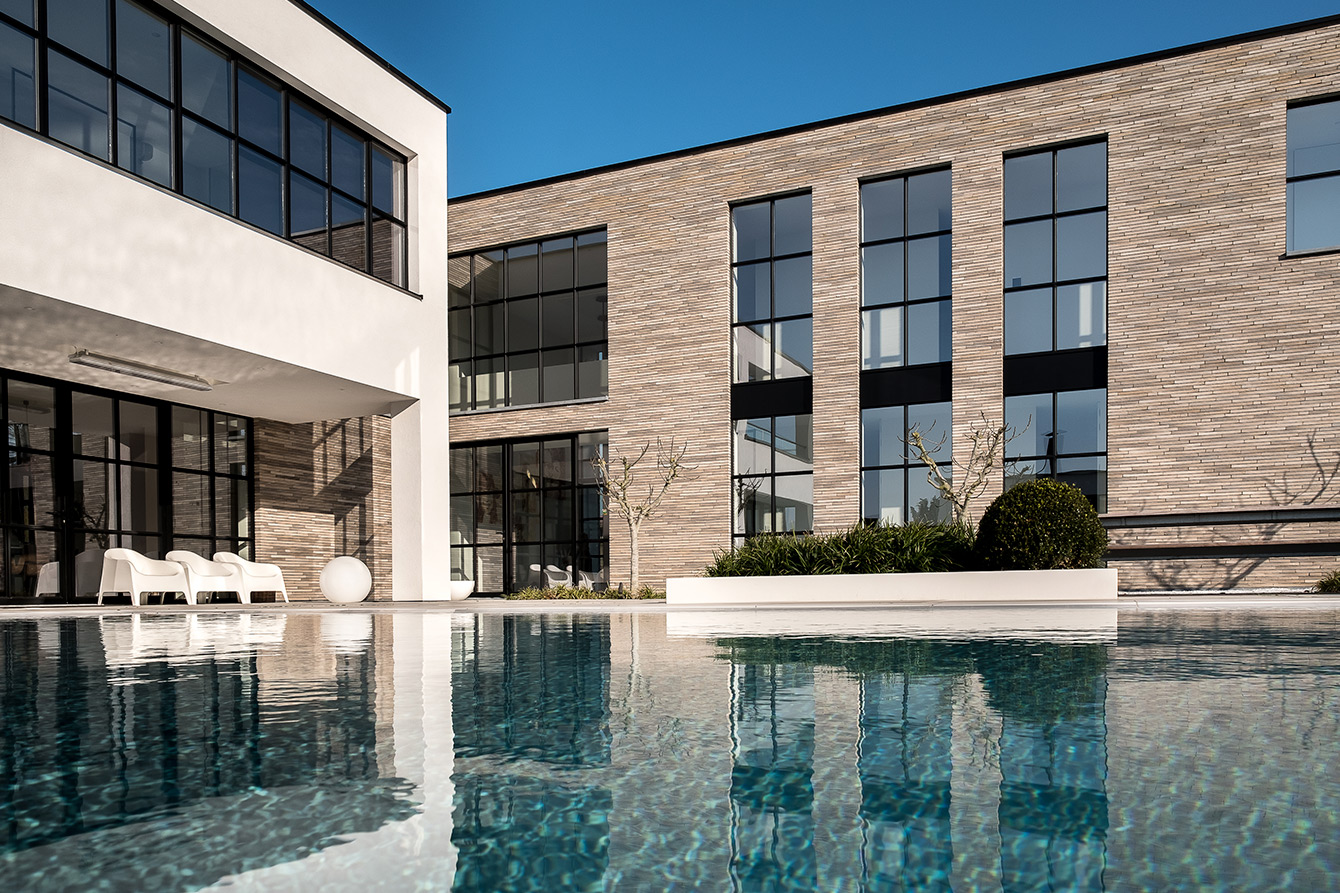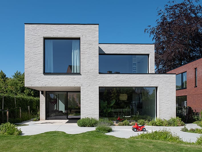 This Belgian villa is a bold statement of white vibes, that truly embodies the concept of a million shades of white. Armed with Ultima bricks in full white, the architect has created relaxing spaces below brick overhangs, luxurious blends of black and white and brick flooring.