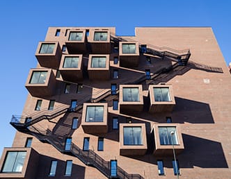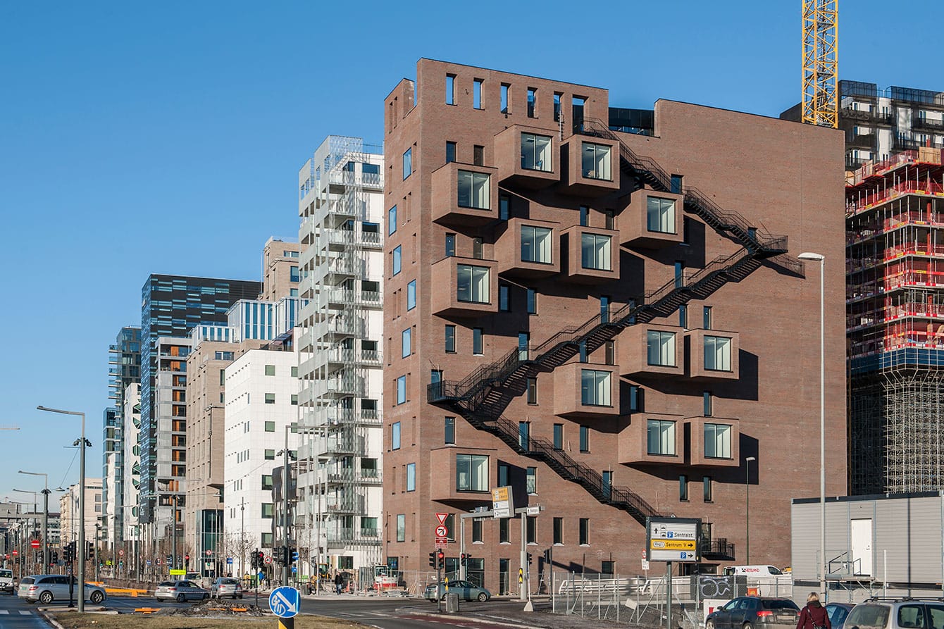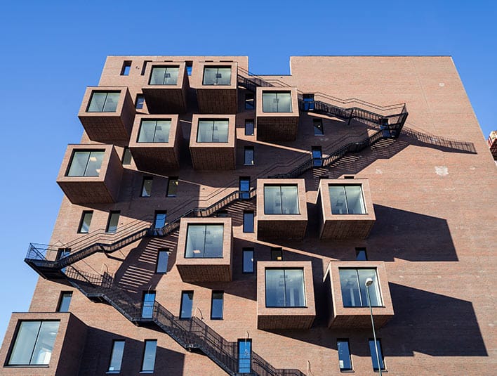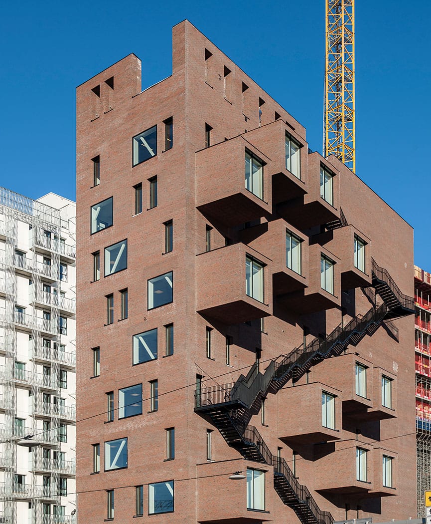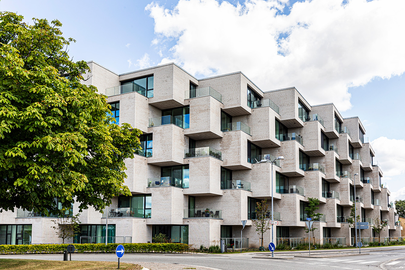 There is nothing minimalistic about this apartment building in Billund in Denmark. Located on the corner of a roundabout, the architectural piece of art works as a design element to the moving townscape.