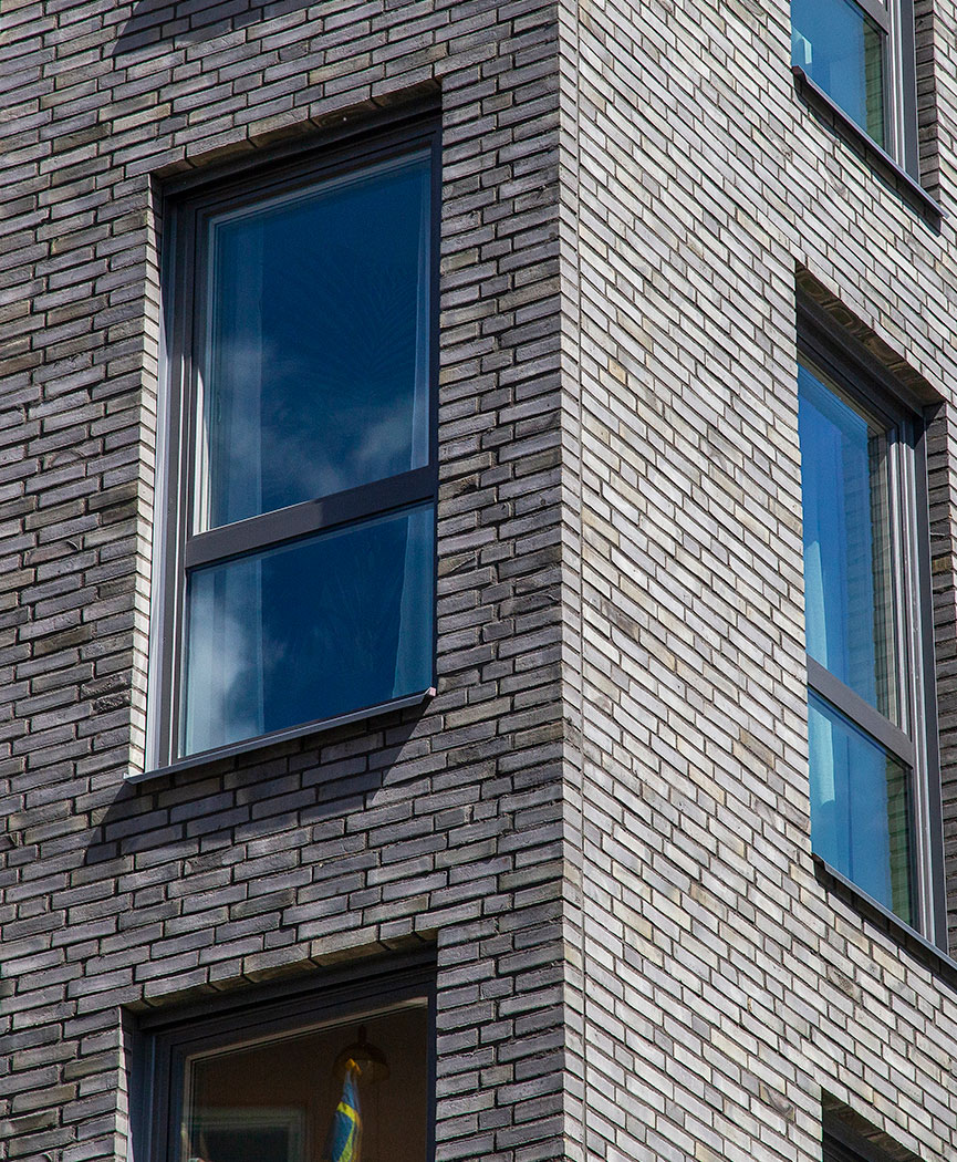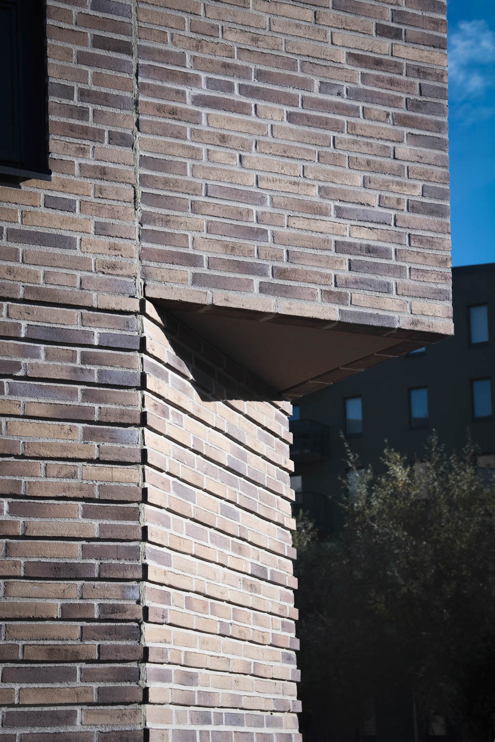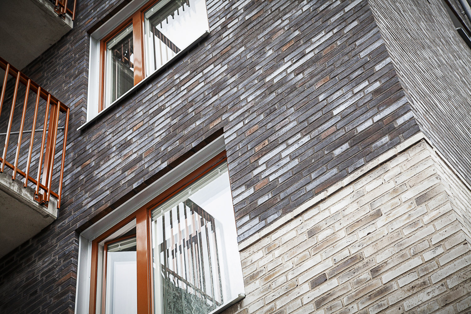 To reinforce the feeling that the house bodies are different individuals who stand for themselves and become personal, we chose different colours on the brick and different colours on the joints. After Randers Tegel delivered many test boards with different bricks and different colours on the joint, the choice finally fell on three joint colours and three types of bricks, RT475-Bari, RT575-Fusion, and RT571-Fusion. We also chose to work with different types of pattern masonry, such as copper in standing joints and cantilevers in the street level of the facades to create an exciting expression in the facades. The colour choice for the windows was also important. Because some windows got a dark colour and others a white colour on the window frames, the personality of the house bodies is further strengthened. To avoid getting a feeling that the houses were moving away from the street, we let the stairs from the apartments to the north go down to the sidewalk. Thanks to this, we connected the street with the houses and achieved a Brooklyn feeling… albeit in Eskilstuna vintage.