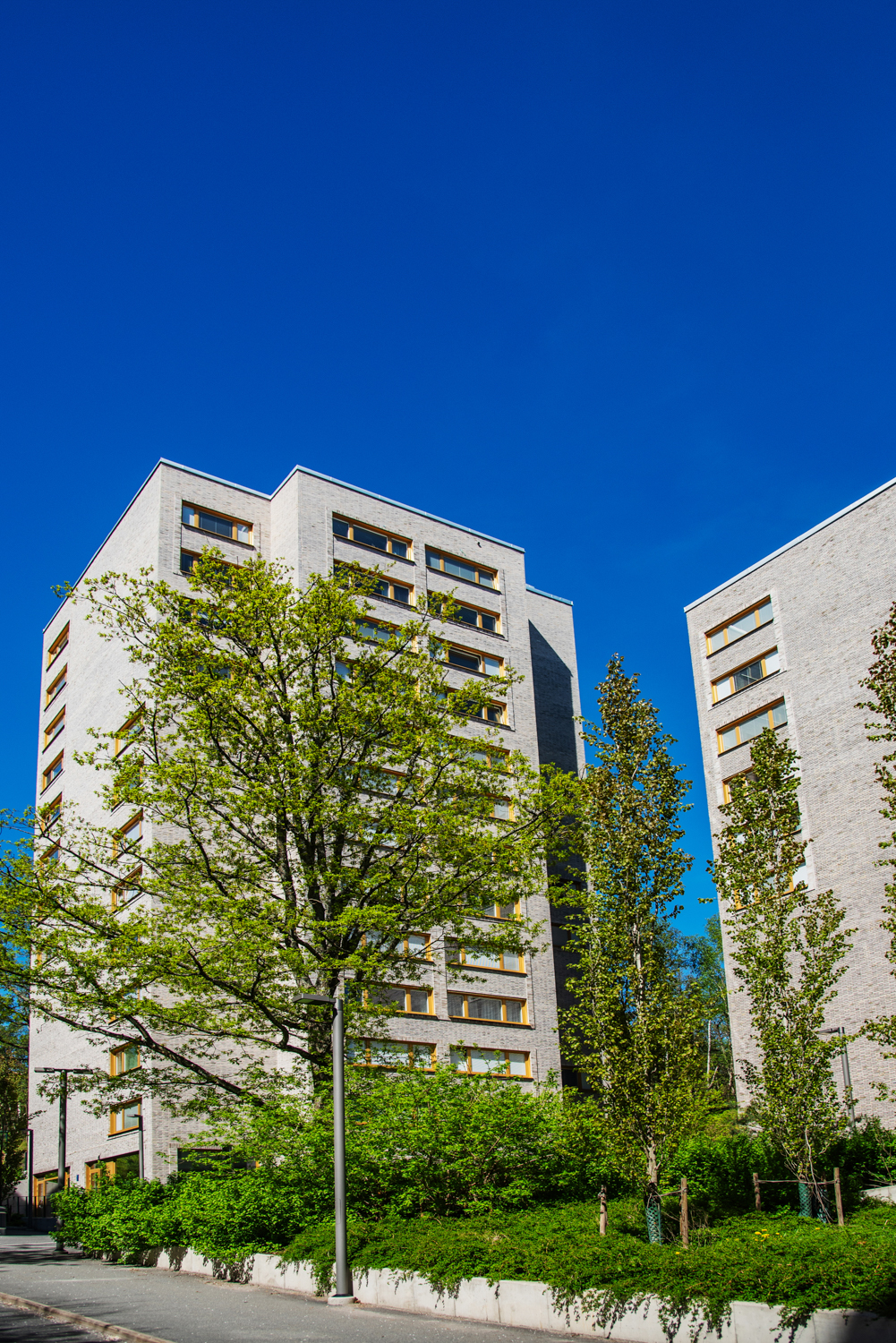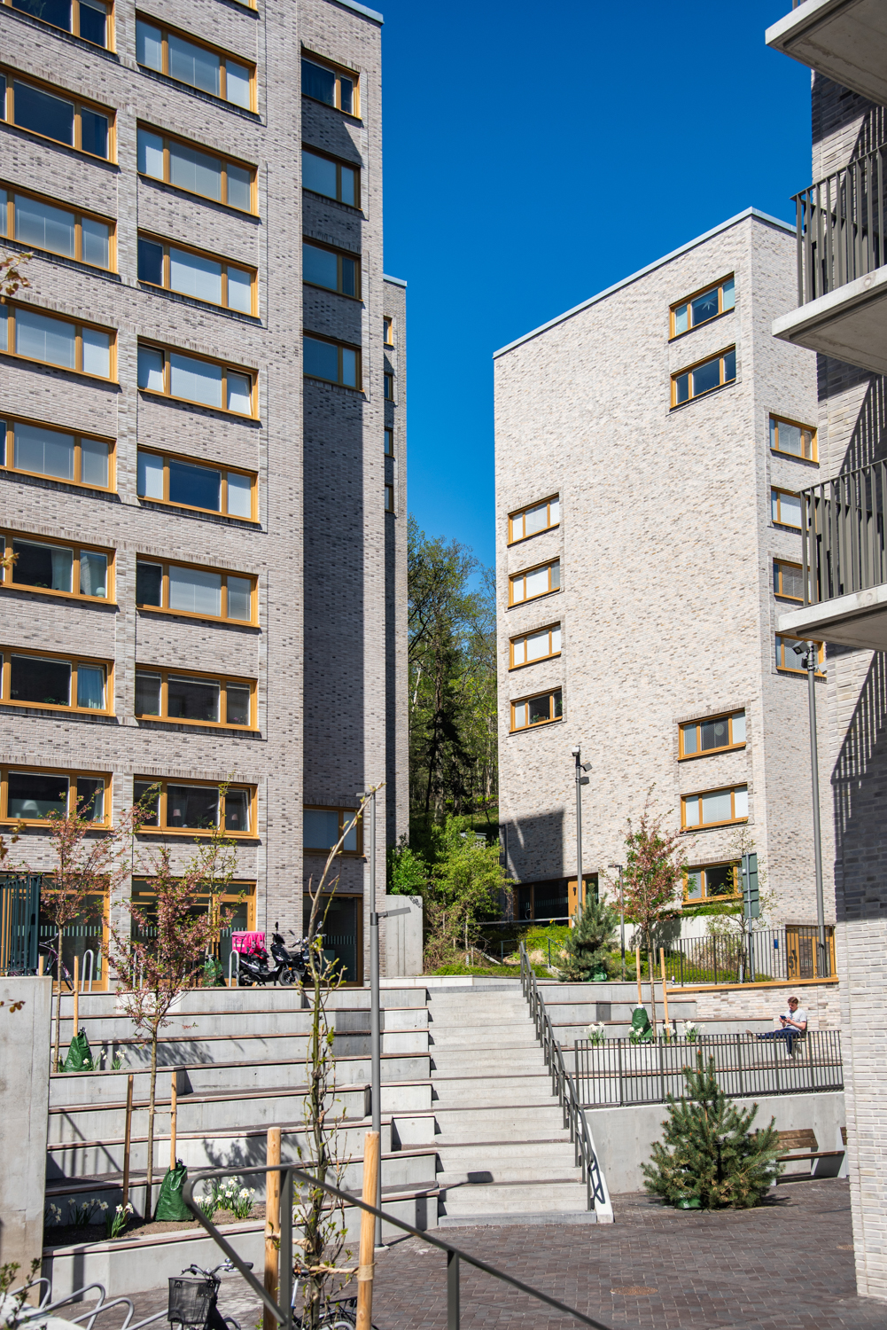 A-Lab Architects was given with the opportunity to transform this former industrial area of Oslo into a new attractive residential area, that takes advantage of the beautiful natural surroundings. With close proximity to Mærradalen, the north-faces sloped terrain carves through the open courtyard. By designing the apartments with light coming from two sides, the recreative spaces thrives with light.