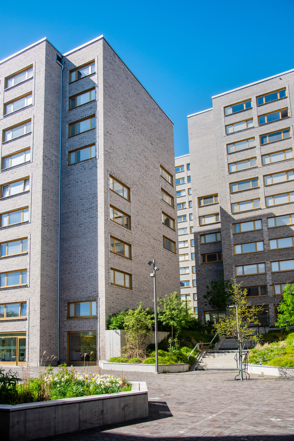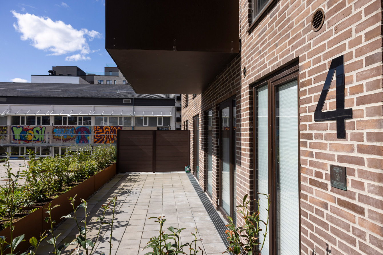 Runt entréerna till de nya bostadshusen möts besökarna av mönstermurningar och mönsterlagd marksten, något som skapar en inbjudande atmosfär och en känsla av välkomnande och det lilla extra för de boende.