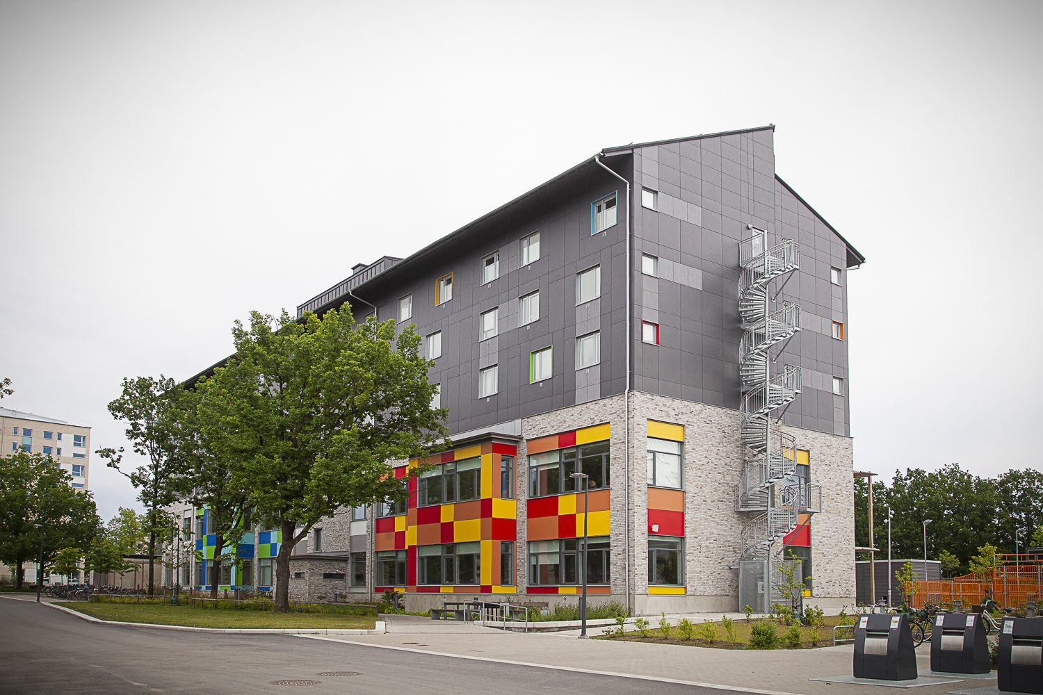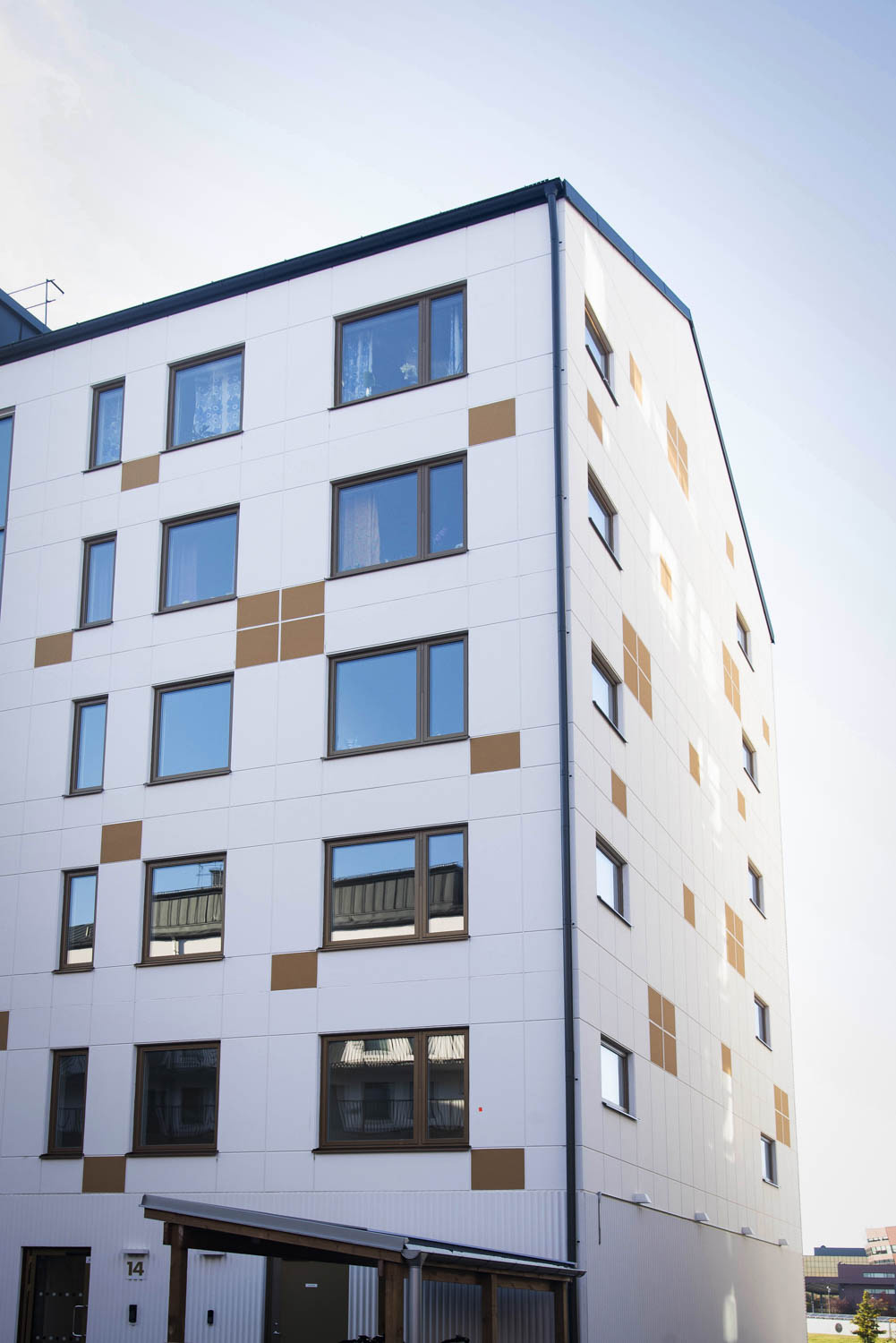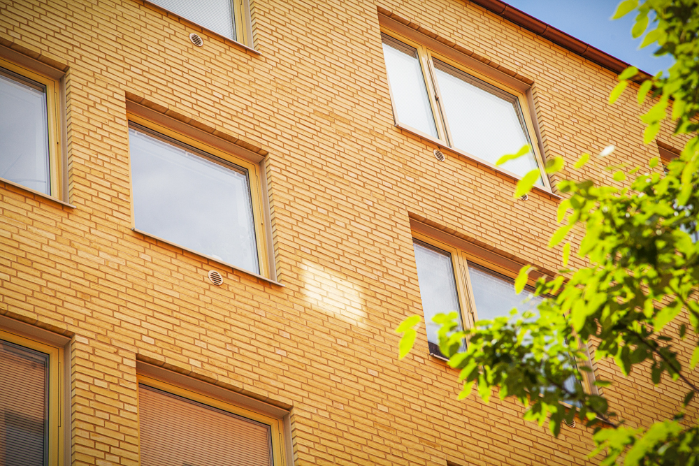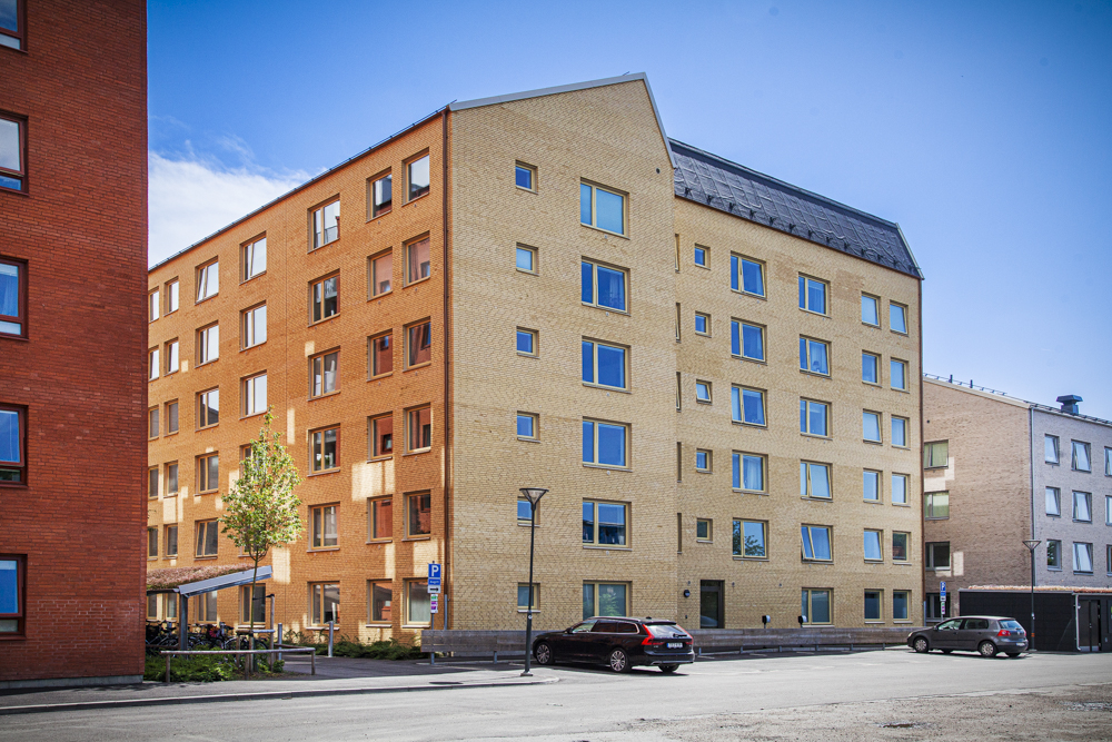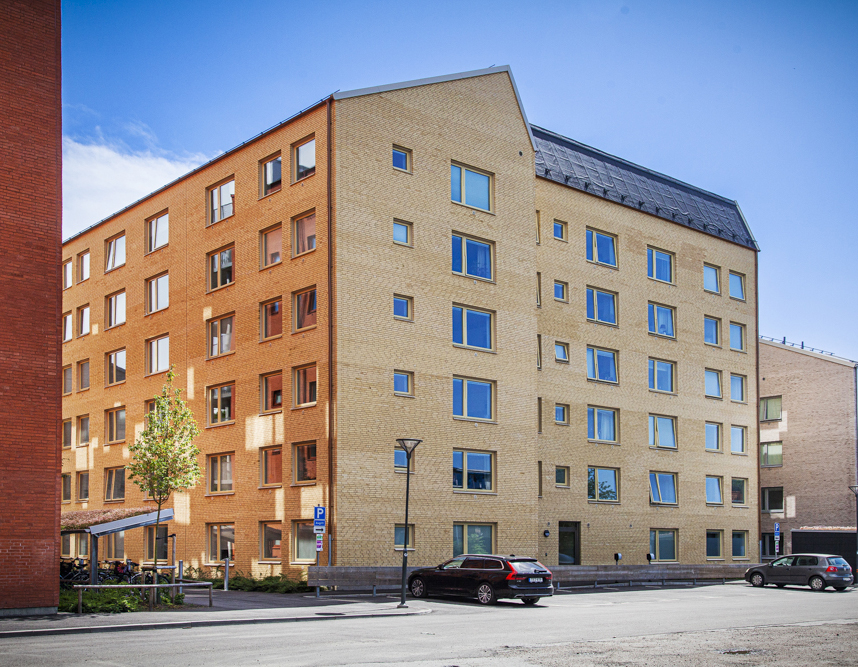 Apartment building in Sweden with bright light-yellow bricks that give a classic and modern look. 58 space-optimized apartments dwell in the outskirts of Uppsala with green recreative areas for inhabitants to enjoy.