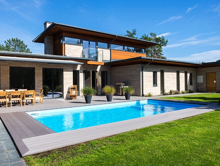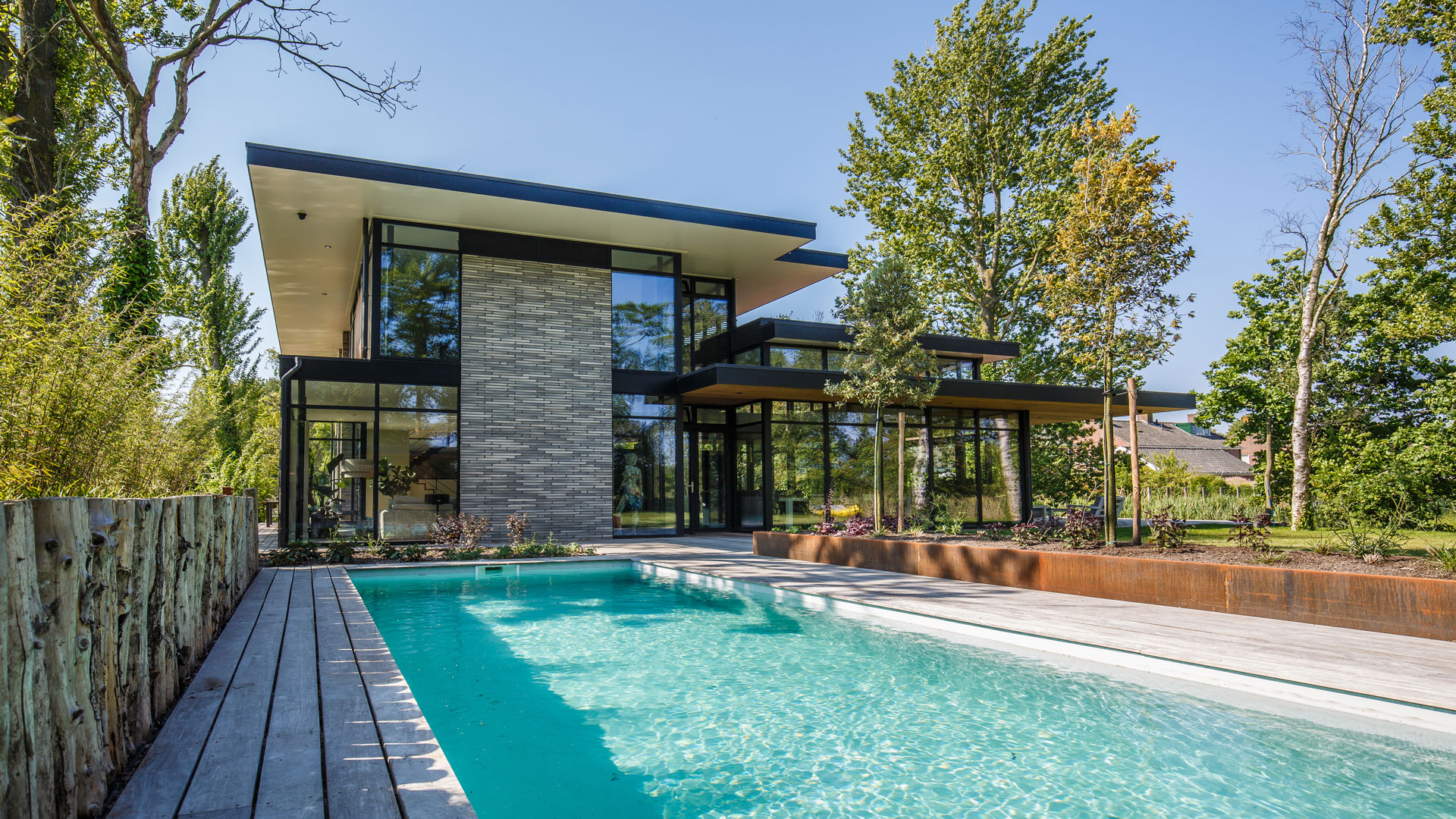 Surrounded by trees and flanked by a tempting pool, this home offers quite a welcome. A welcome that is supported by the pleasant minimalism radiated by the combination of glass, light concrete and muted brick colours.