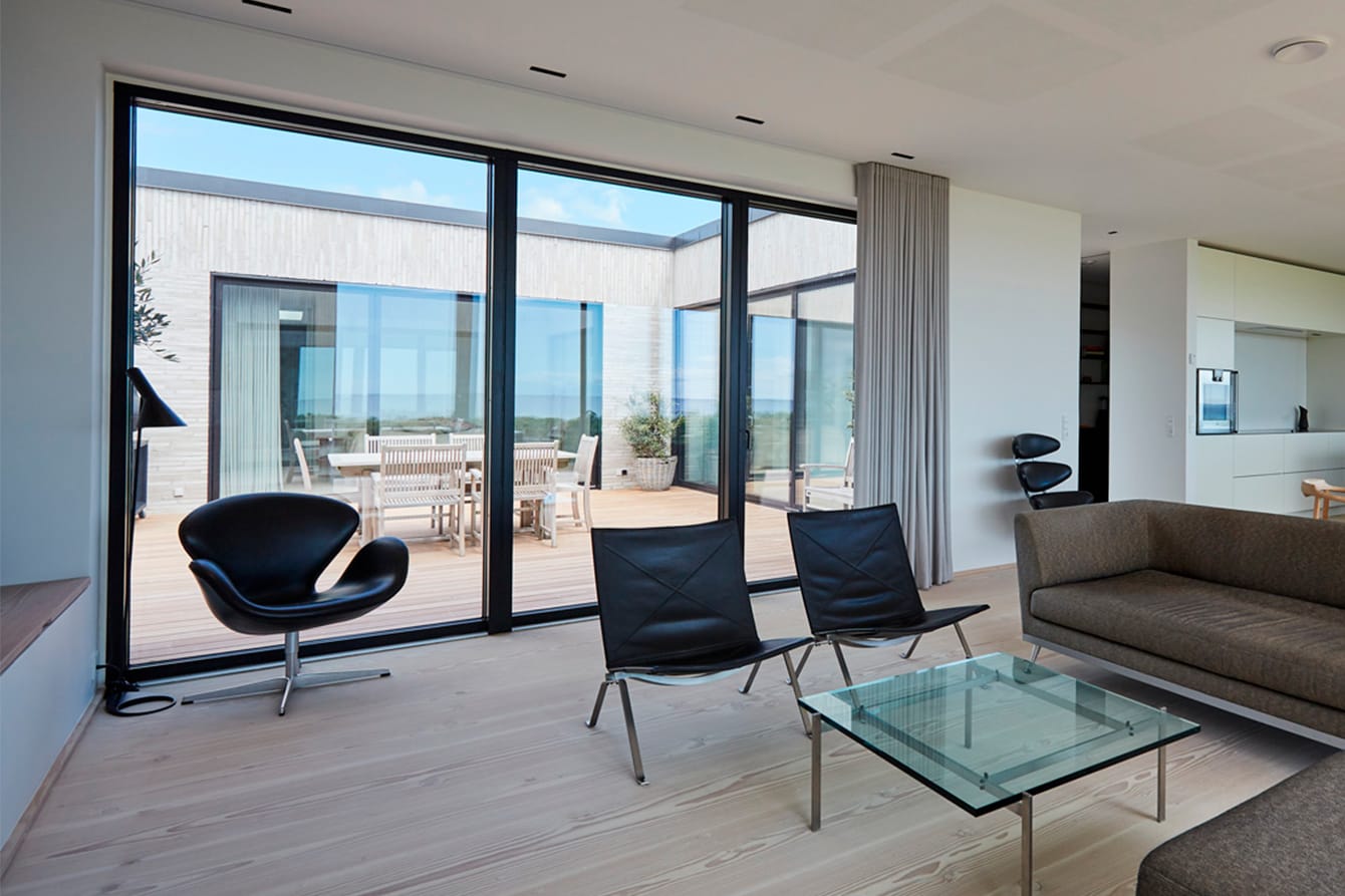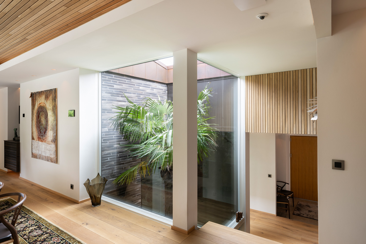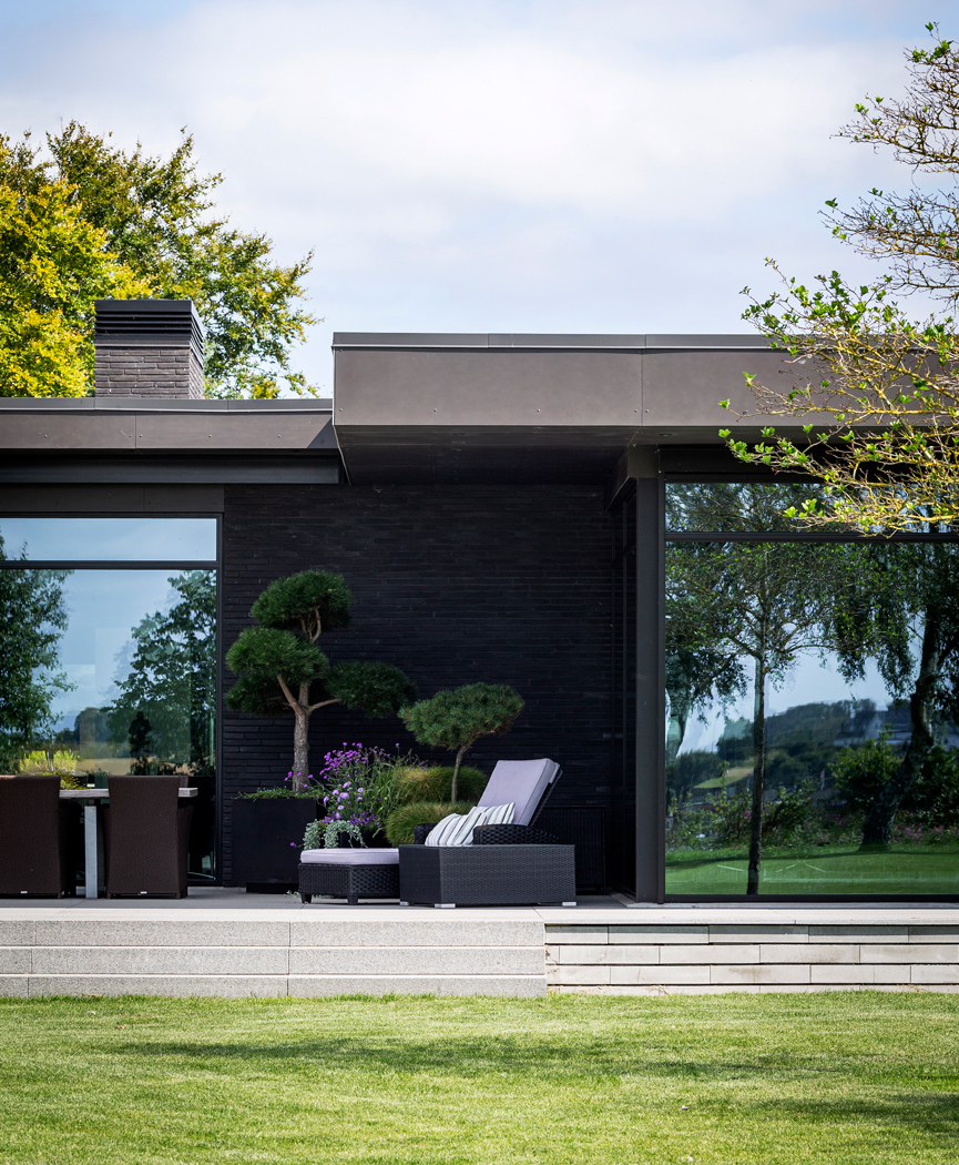 From the street, the house is private with few windows, but from the garden – and the sea – the house opens op with great glass sections and a large terrace. The atrium in the centre of the villa provides a great natural inflow of light as well as small courtyard, that adds charm to the house.