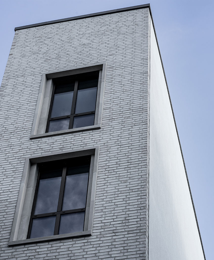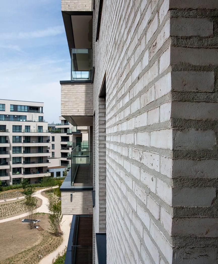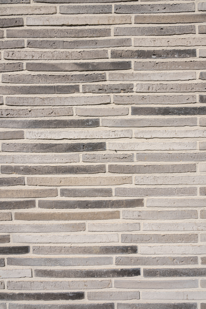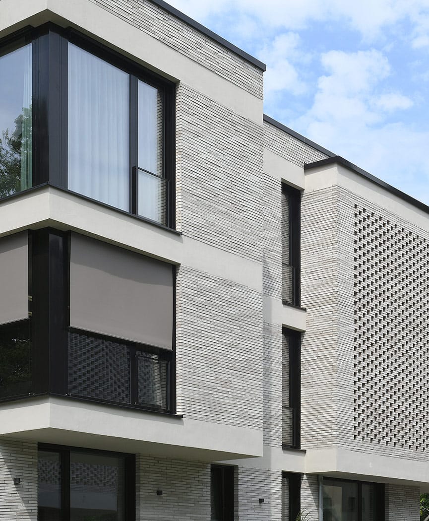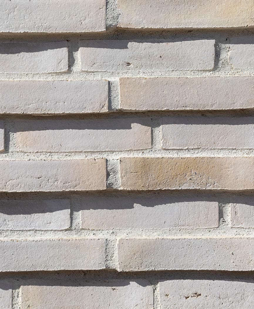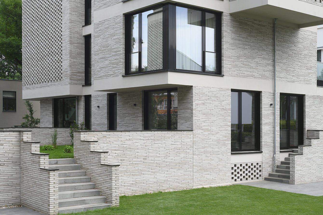This apartment complex in Brussels has a modernistic ring to it. When massively upscaling Unika Apollon’s soft waterstruck surfaces with gray-white color play, the brickwork’s snowy elegance creates a strong contrast to the black metallic window frames and floating balconies. The unique surface structure gives the finished construction a distinct and dynamic façade, rich in variations.