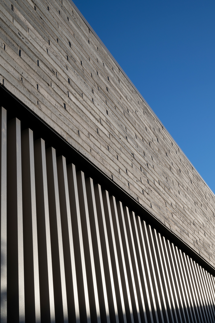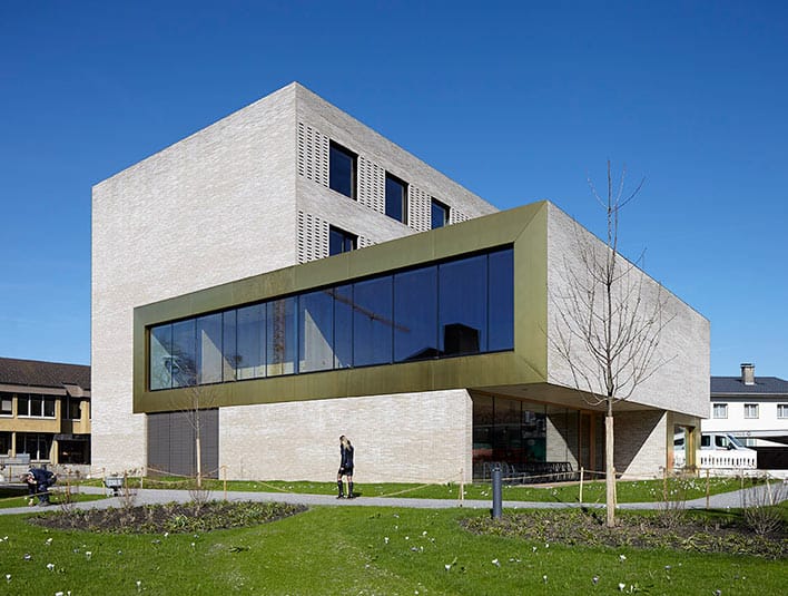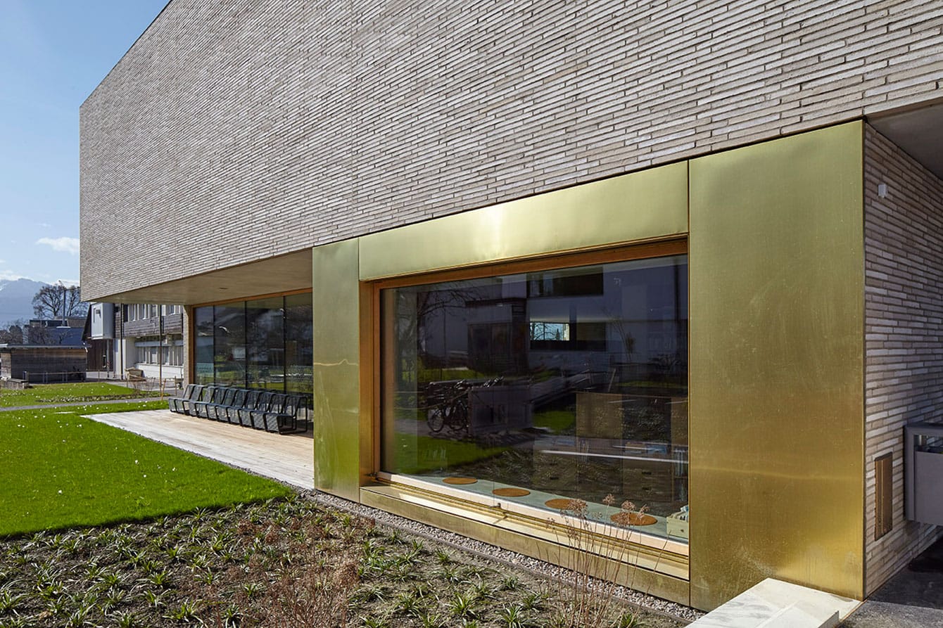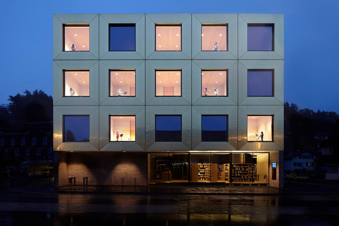 The new music school and library in Wolfurt, Austria fits into this existing ensemble of school, kindergarten, clubhouse, municipal office and hotel. The brass façade, faced towards the street, plays elegantly with the building's other material choices. Twelve striking, wide-framed square windows mark the music classes behind it.