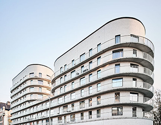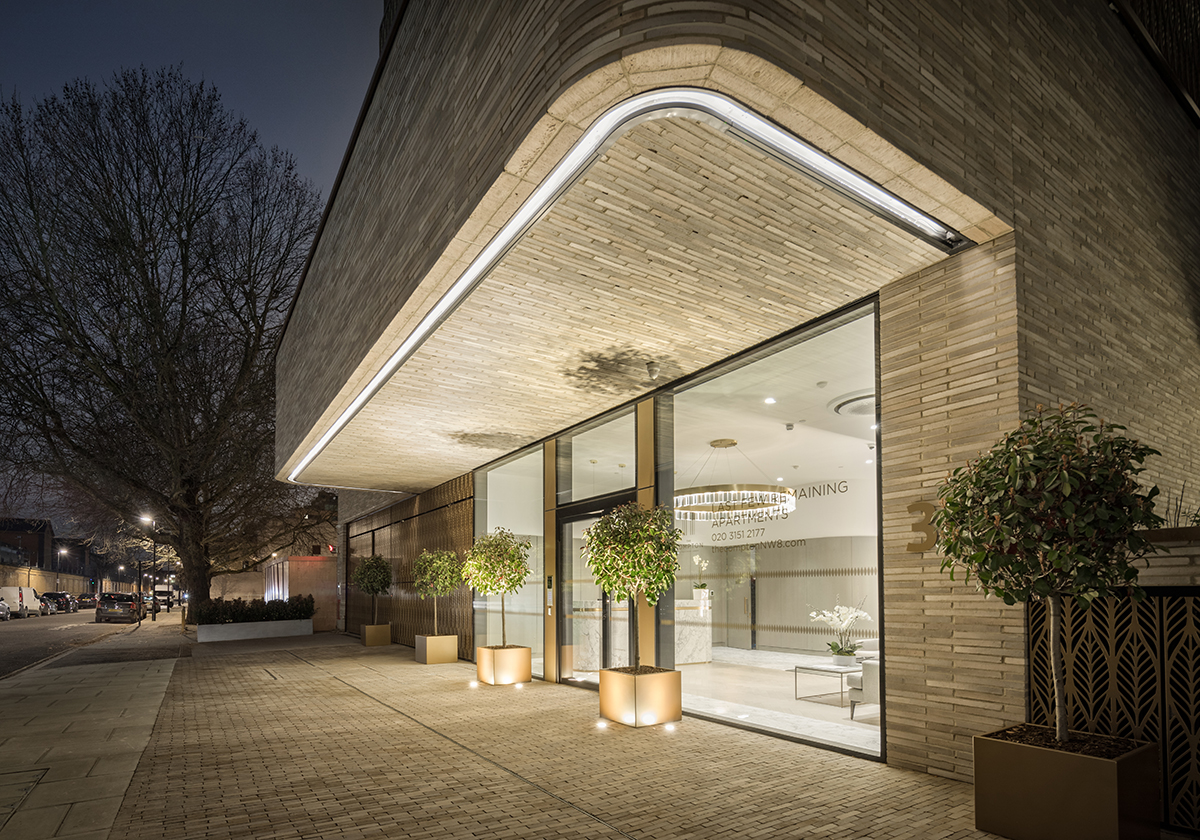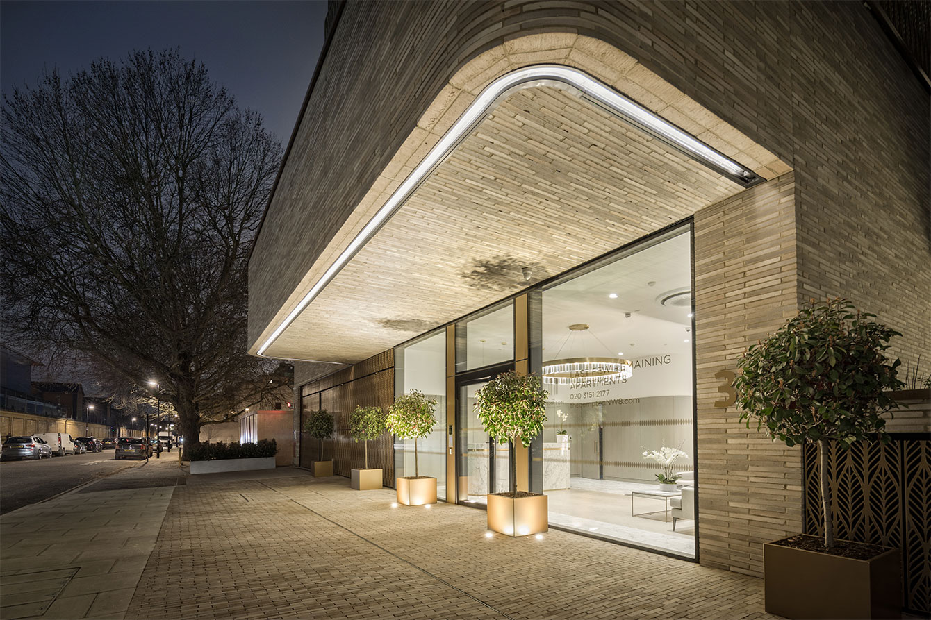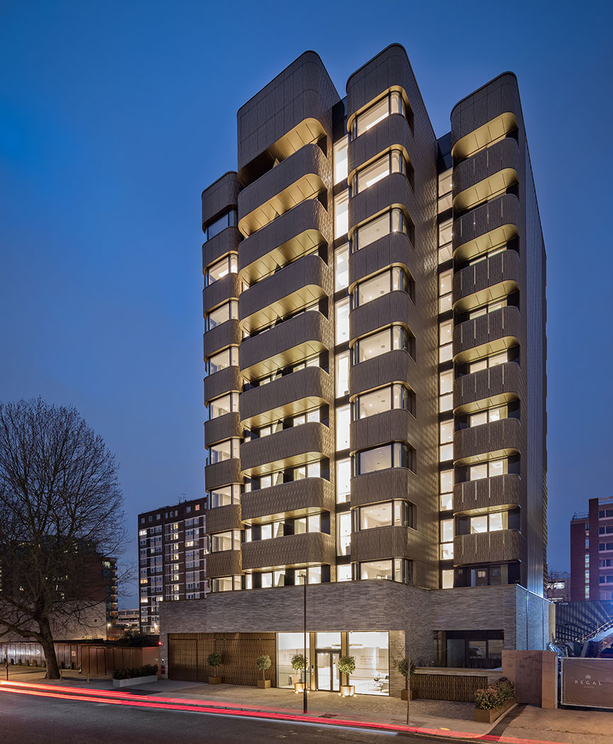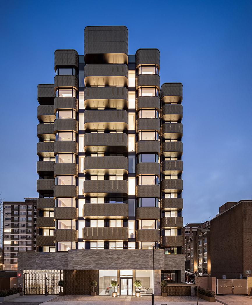 Each of the 49 apartments is planned to make the most of the views allowed by the curved bays, that is also the signature of the building. The bays are adorned with an imprinted leaf pattern – an Art Deco-style reference to the neighbouring Regents Park.