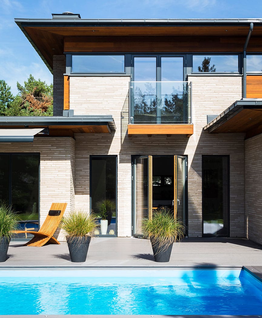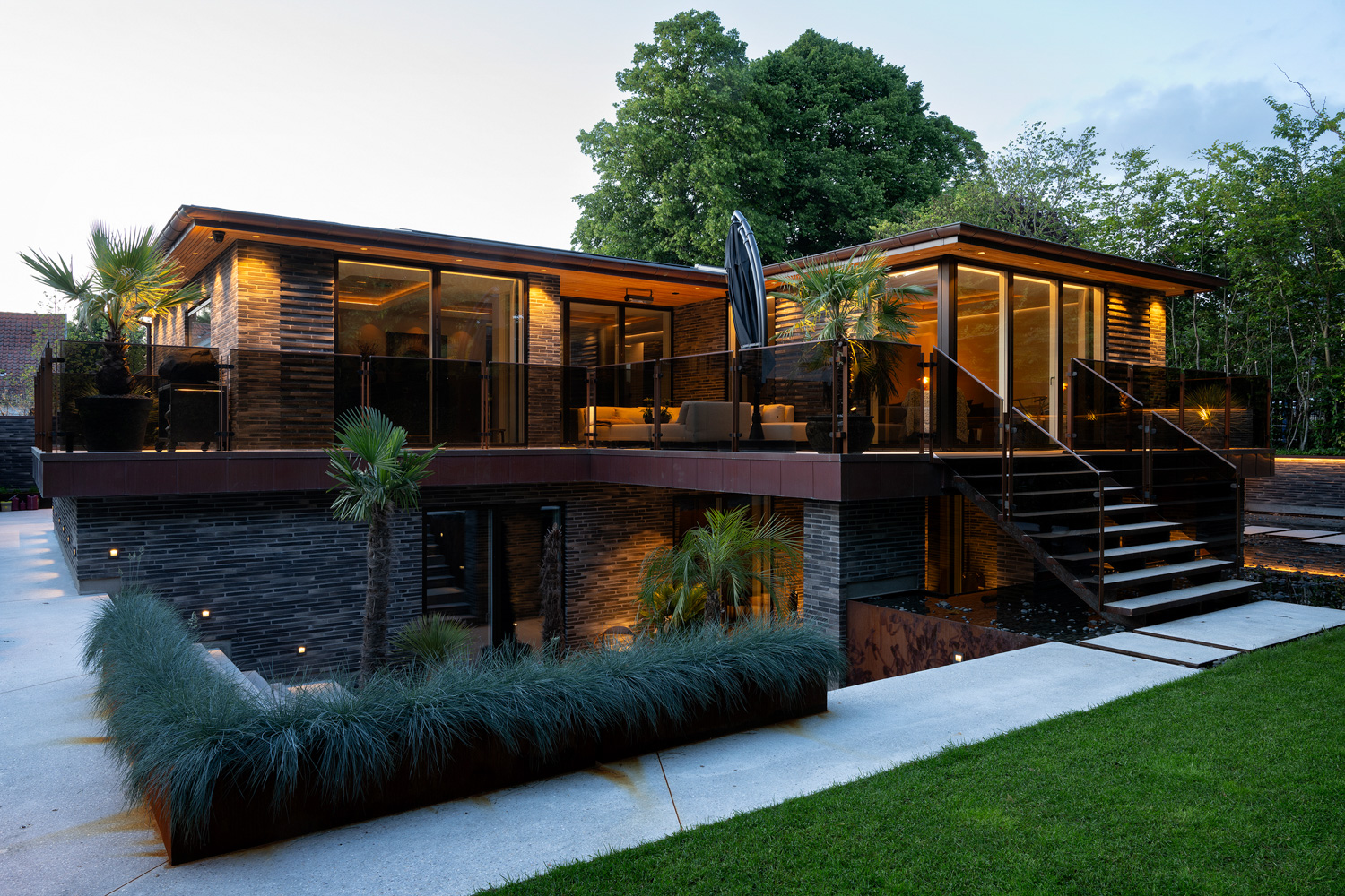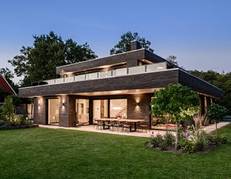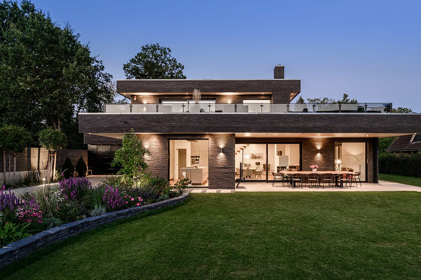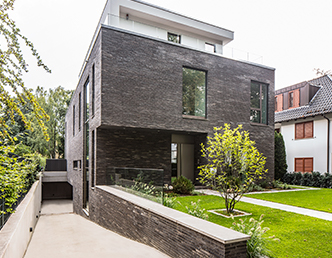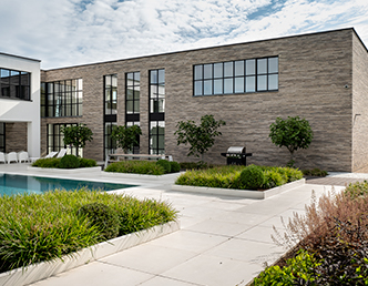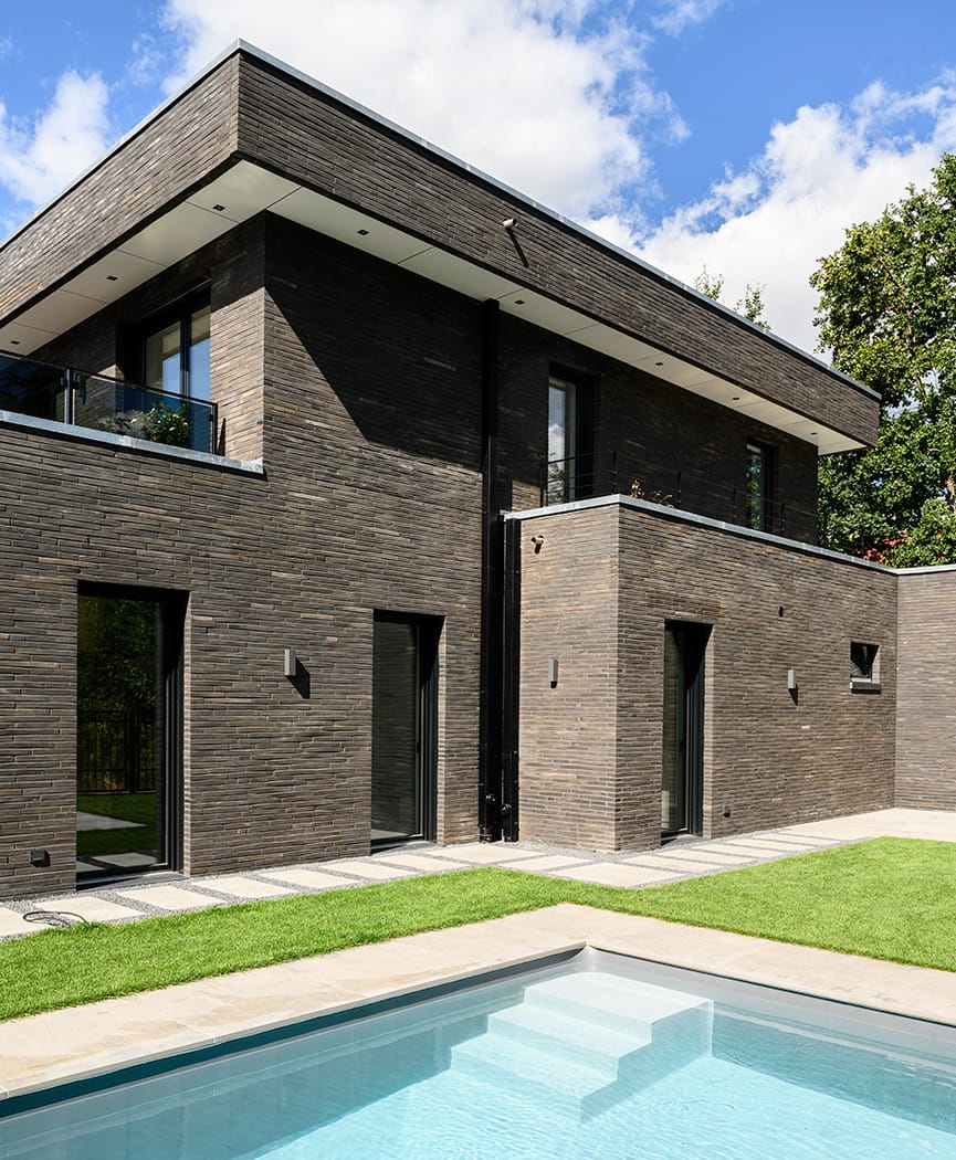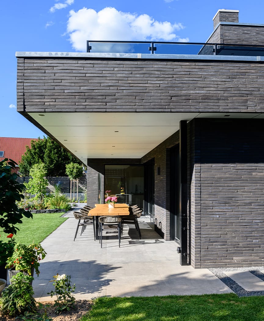 This stunning two-story German villa has fine horizontal lines with comforting overhangs made with dark Ultima-bricks. The floor plan extend the dining and relaxation areas outside sheltered from the element. Upstairs the everlasting summer nights can be enjoyed with a rustic backdrop of soft-moulded long format bricks. Combined with at lush flowering garden this villa has an inviting warm feel to it.