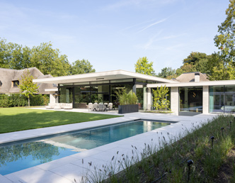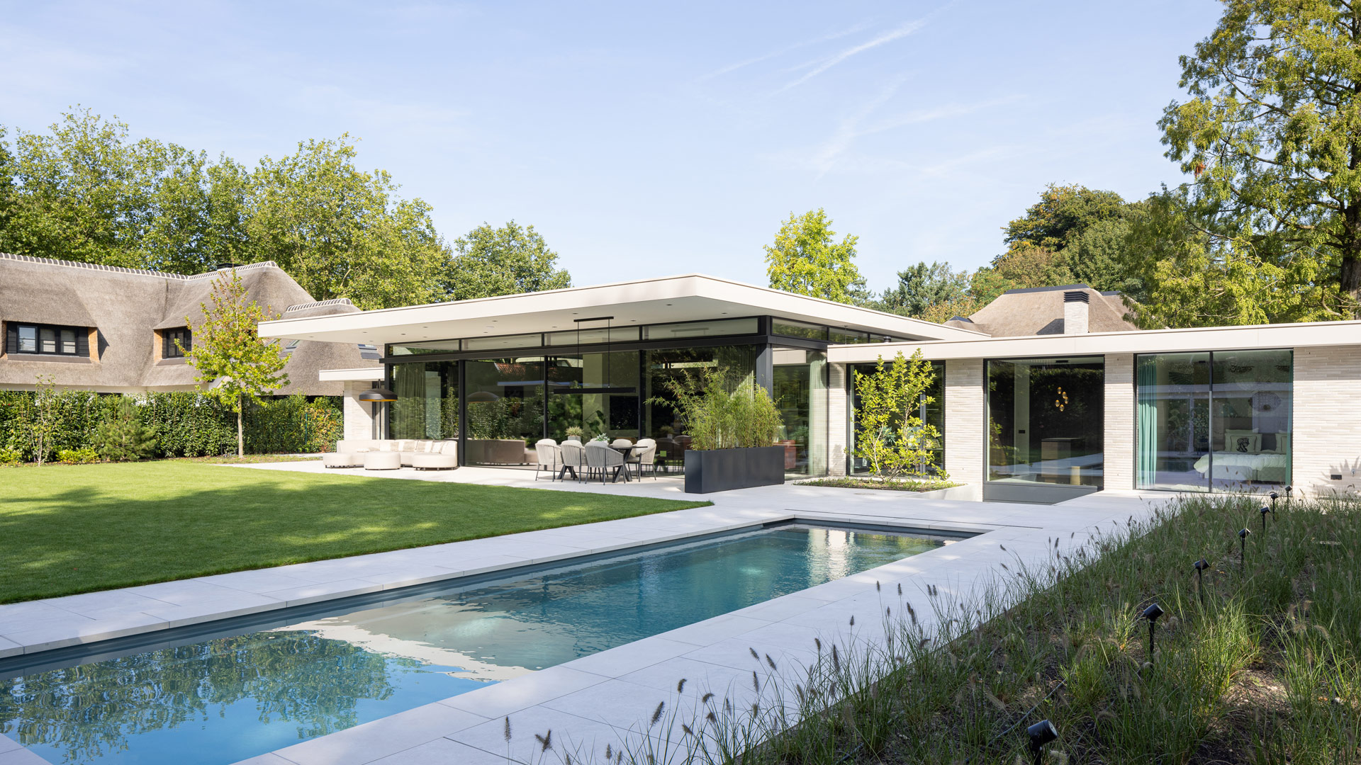 Settled in the background, this Belgian villa doesn’t reveal much, but the rolling meadows and a broad driveway invite you to have a closer look. The layout surrounds a beautiful fig-planted courtyard with two-story floor-to-roof windows that reflect on the sizable swimming pool.