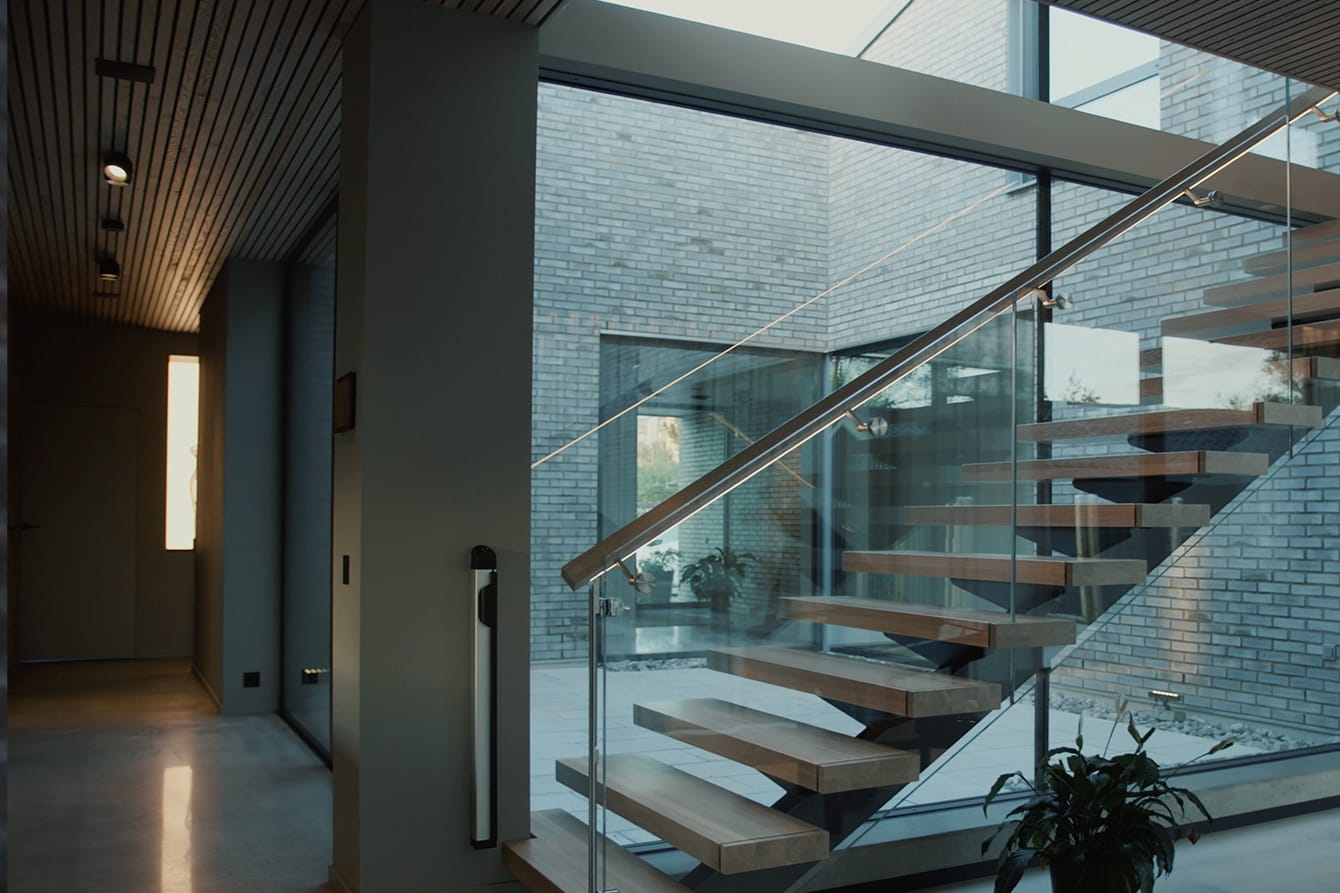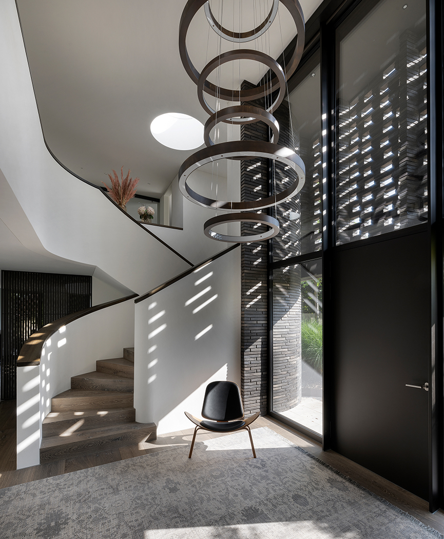 Inspired by the long format’s possibilities to work with vertical alignment and the use of space, the architect has created a circular edged wall that welcomes you at the front door. Organized neatly with the brick flooring this waterstruck Ultima gives a sense of serenity and calm throughout the house.