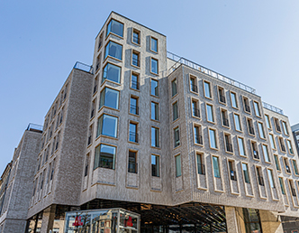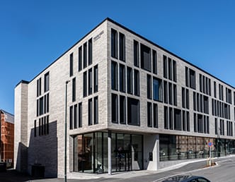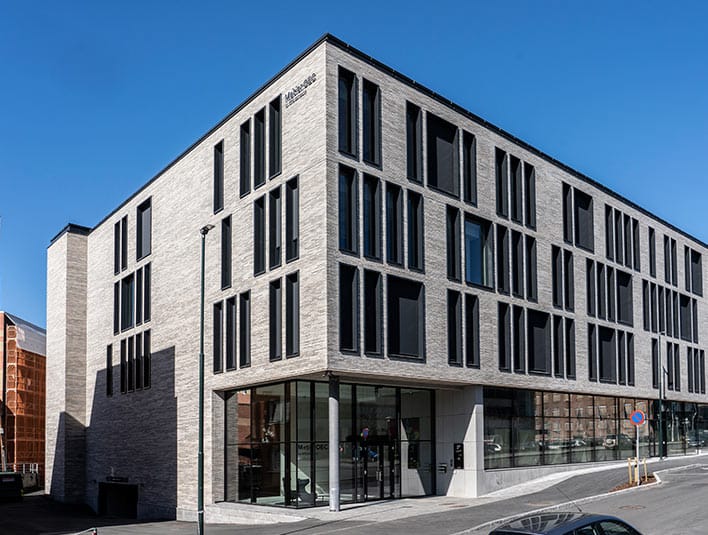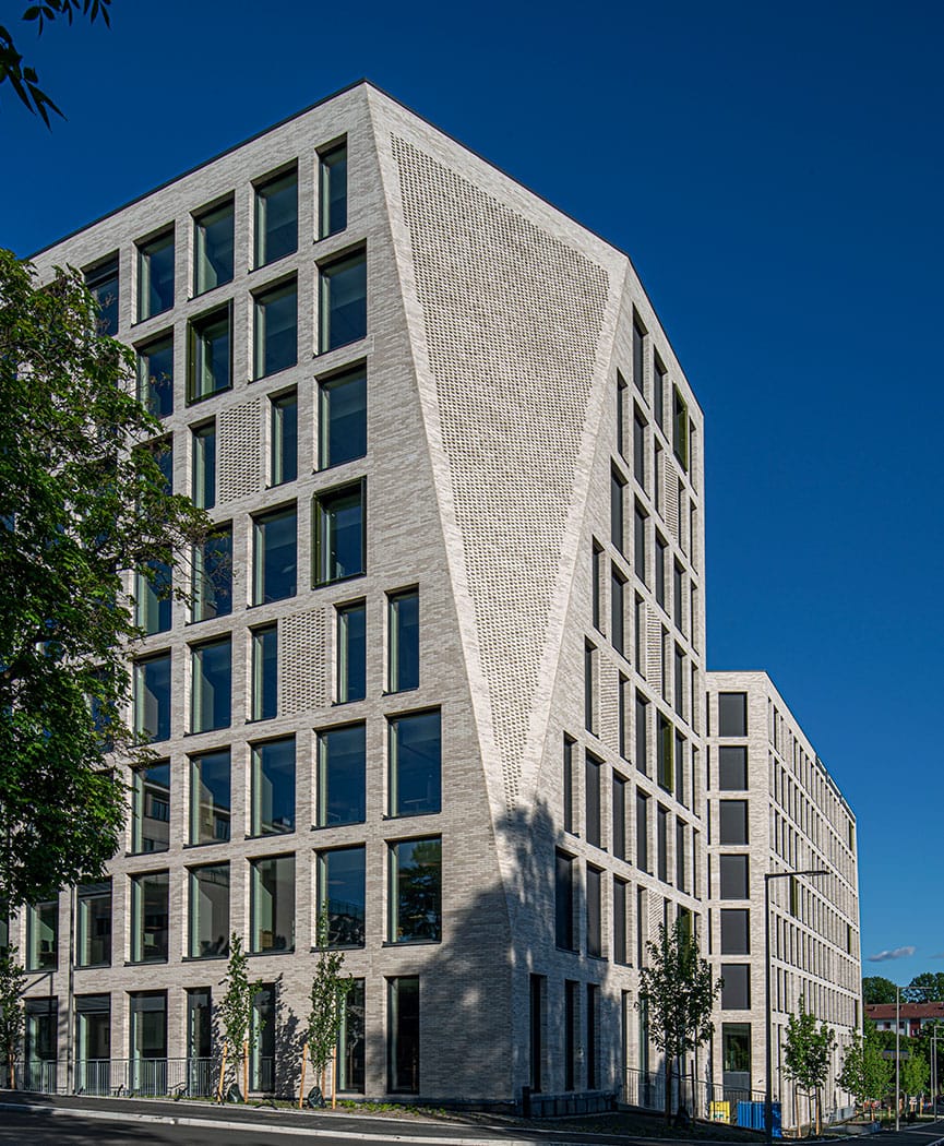 This flexible and modern office building integrates one of Oslo’s main shopping districts into its purpose. The transparent ground floor is framed by an Ultima-brick facade with ceiling-high window sections of varying widths that add life and dynamism to the facade.