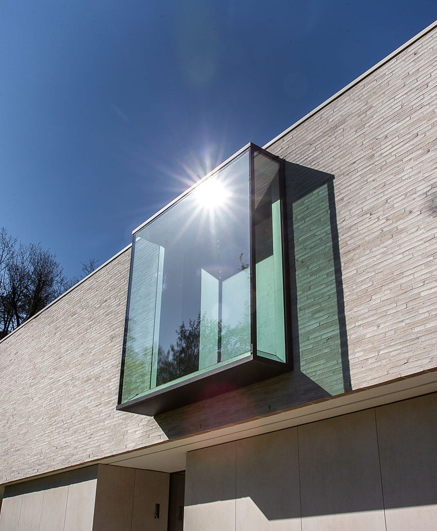 On one side of the surface, a special bonding breaks with the minimalistic façade and adds character to the house. Especially at night, this transparent bond has a significant effect when the indoor illumination shines through.
