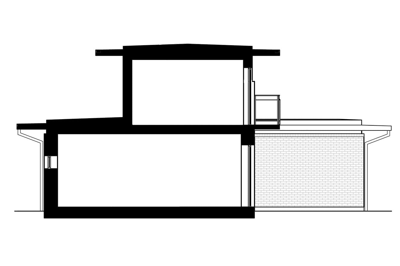 Byggnaden är uppdelad i olika volymer förskjutna i förhållande till varandra med de karaktäristiska smäckra takutsprången.