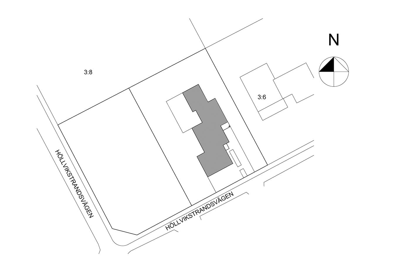 Huset är placerat på tomten med långfasad i sydväst där alla rum har kontakt med trädgårdssidan med terrass och pool.