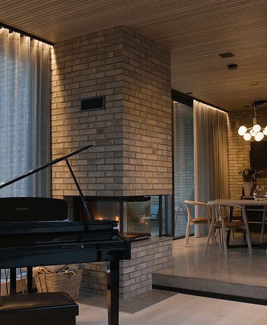 The supreme detail of this project might just be brick flooring. From the entrance, the brick floor continues its flow indoors, inviting guests to the spacious kitchen and common area with panoramic views of the garden. Outside the intention is to create an organic flow of lush green together with the playful swirling concrete pavement. From the living and dining area, floor-to-ceiling sliding doors lead to a brick-covered patio with an open fireplace completely made of bricks.