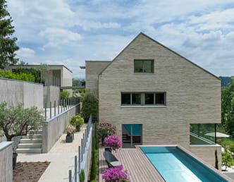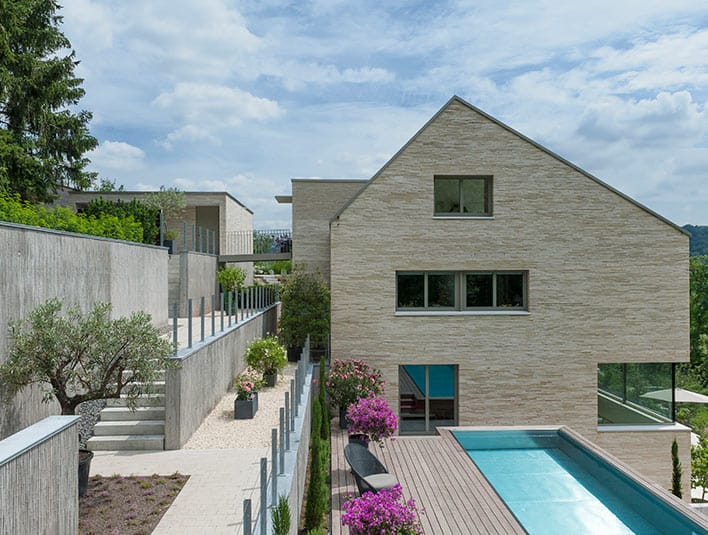 Hidden in the sloped landscape near Stuttgart is a villa with Mediterranean feel. Amongst olive trees and bougainvilleas is a stress-free zone by the pool. The outdoor area is framed by the warm and light-tinted sandy feel from the brick walls.