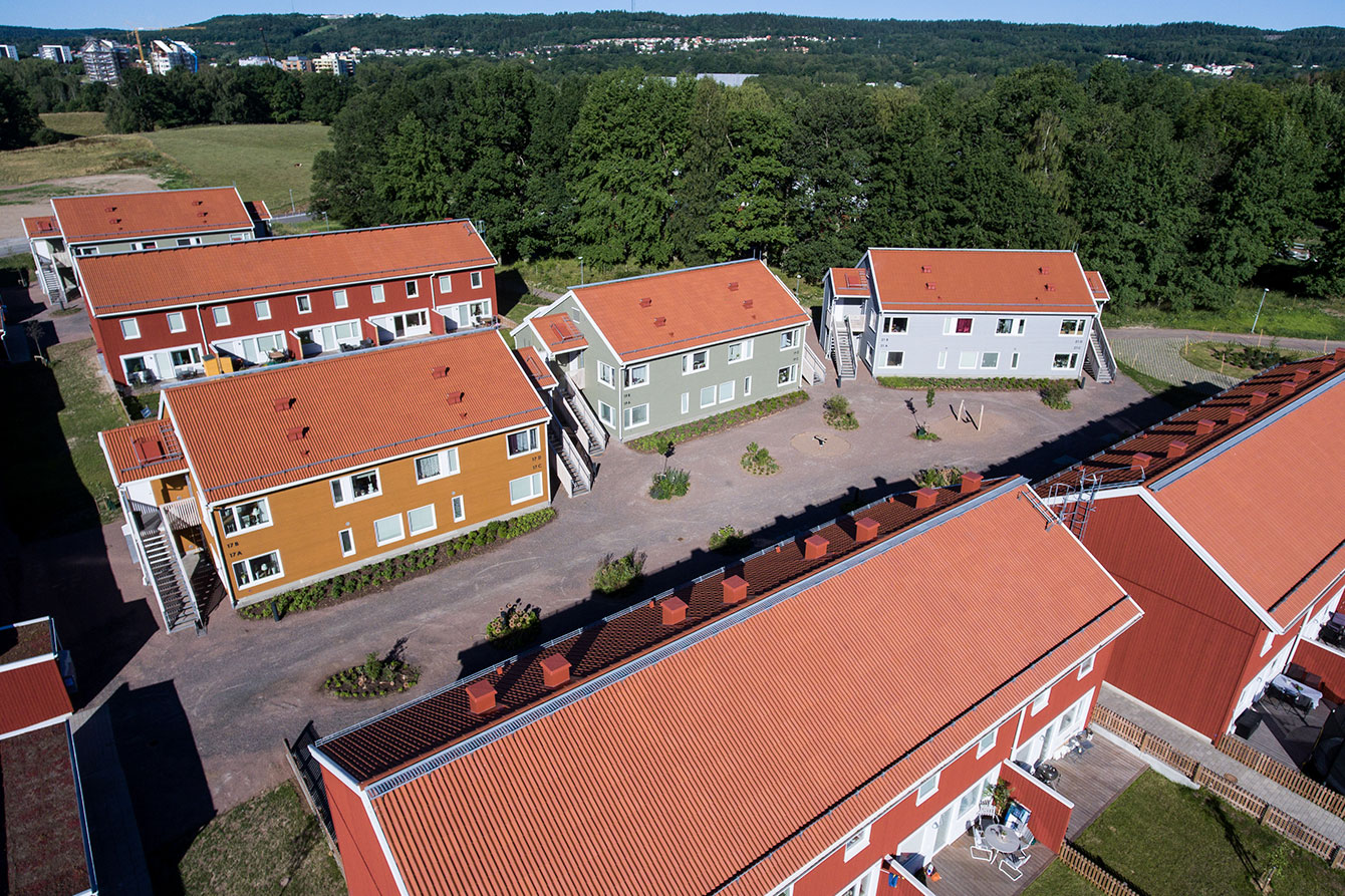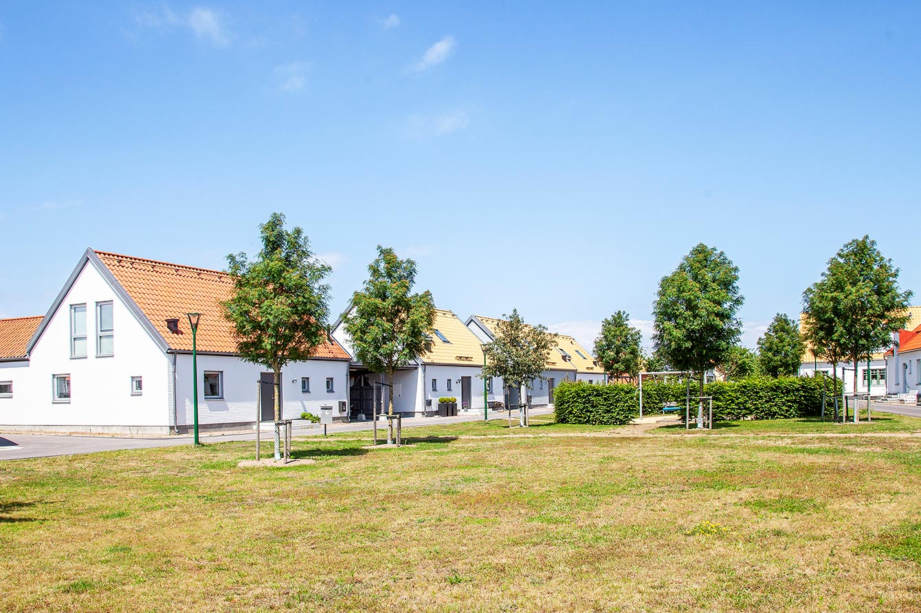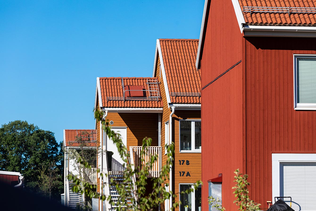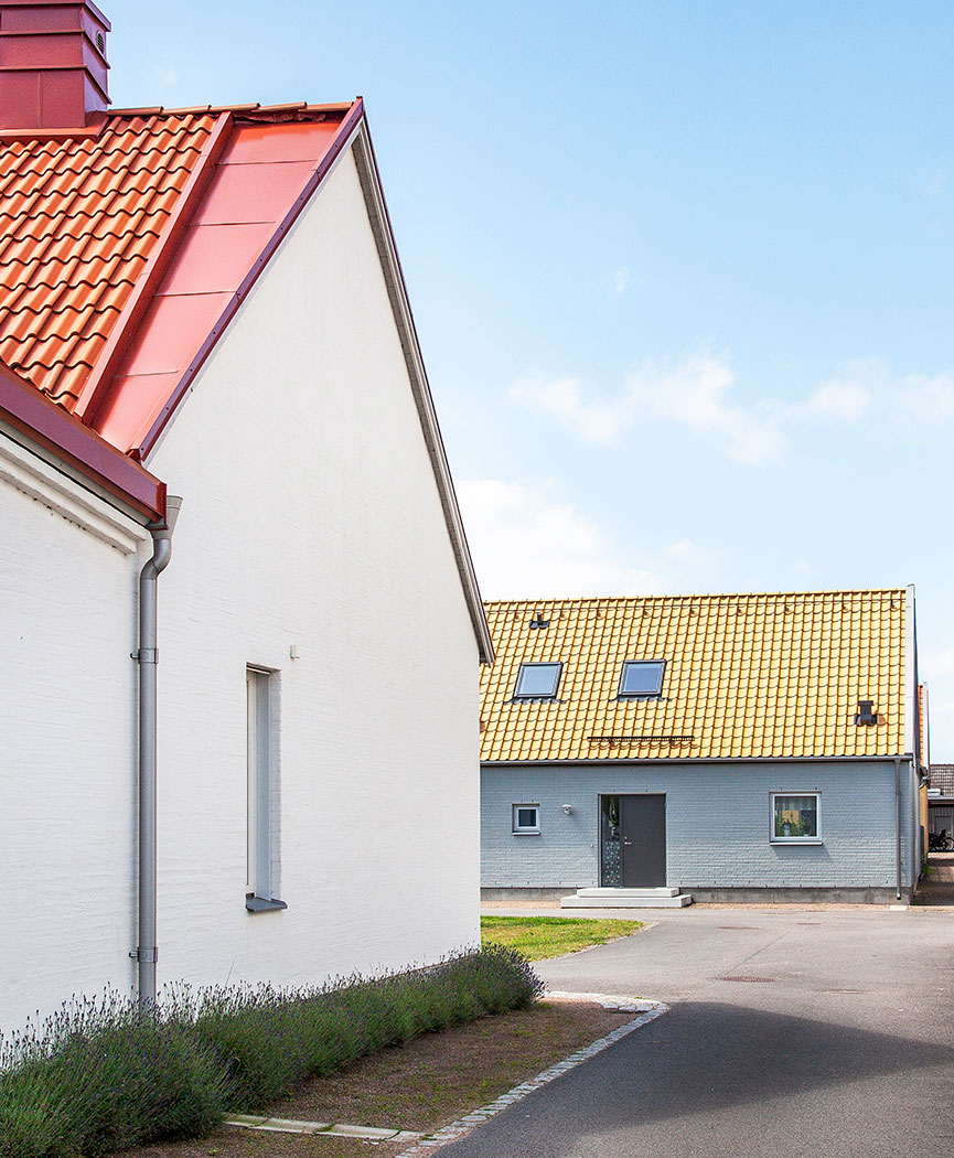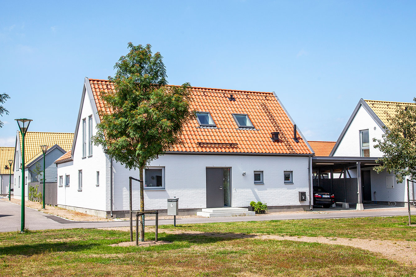 Typical South Swedish style houses with classic red roof tiles in a cluster of similar houses. Roof windows let in the light in the classical small family houses.