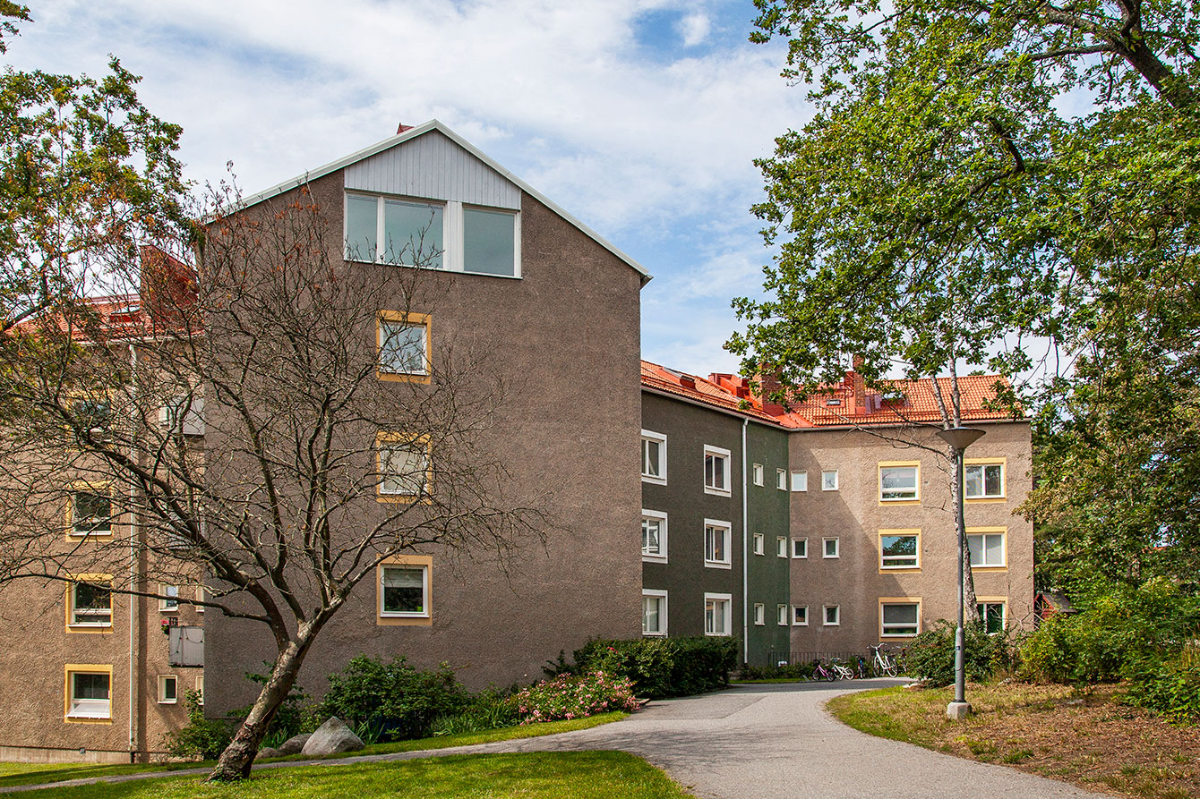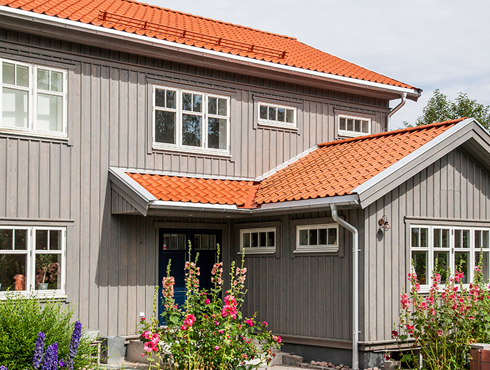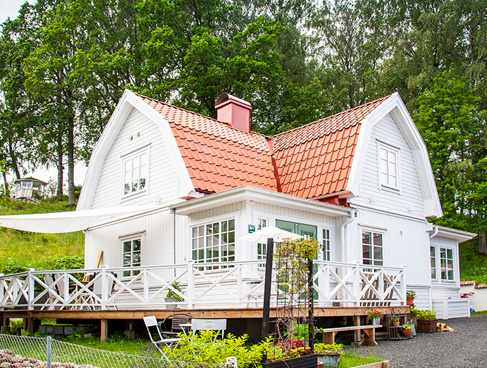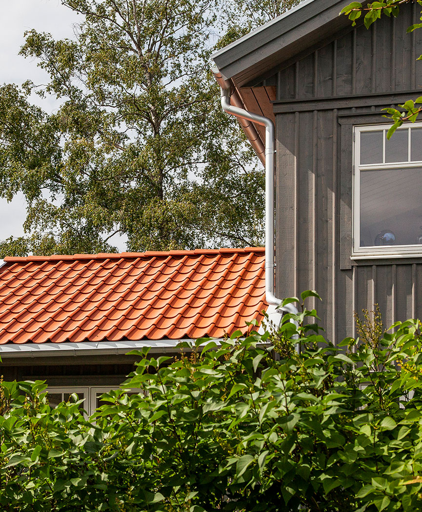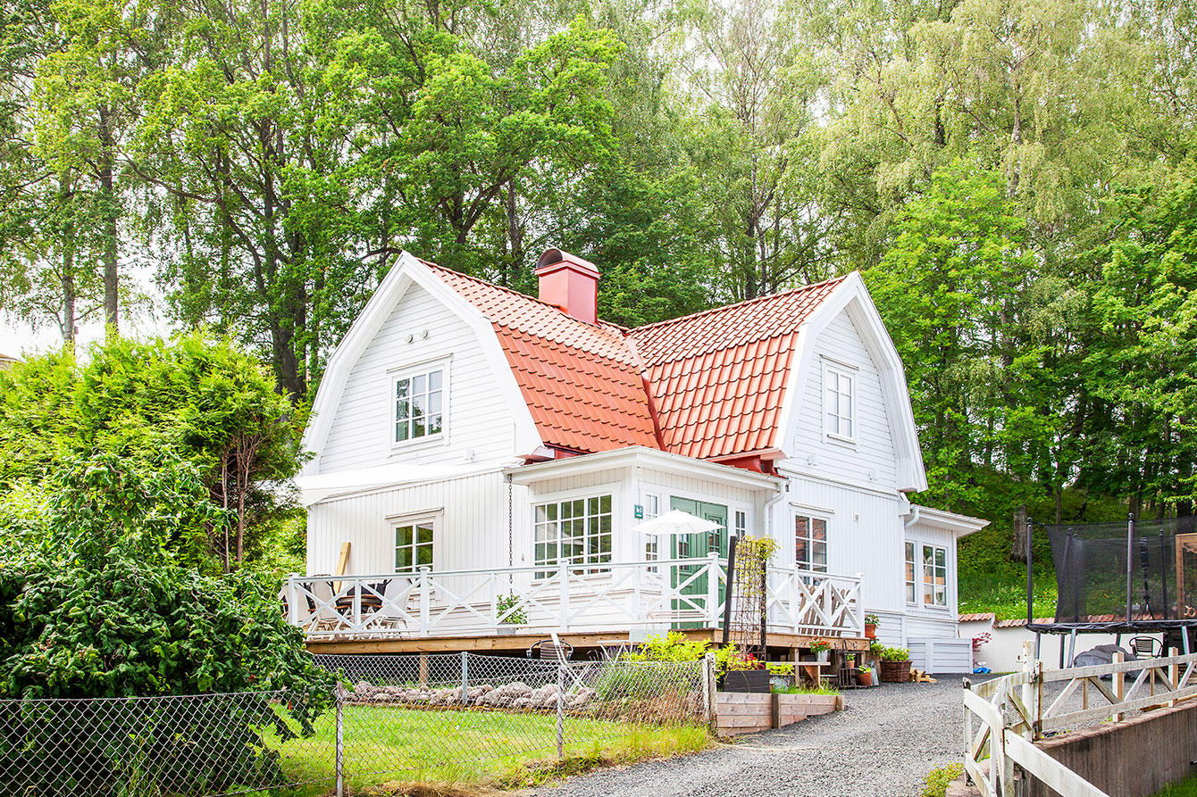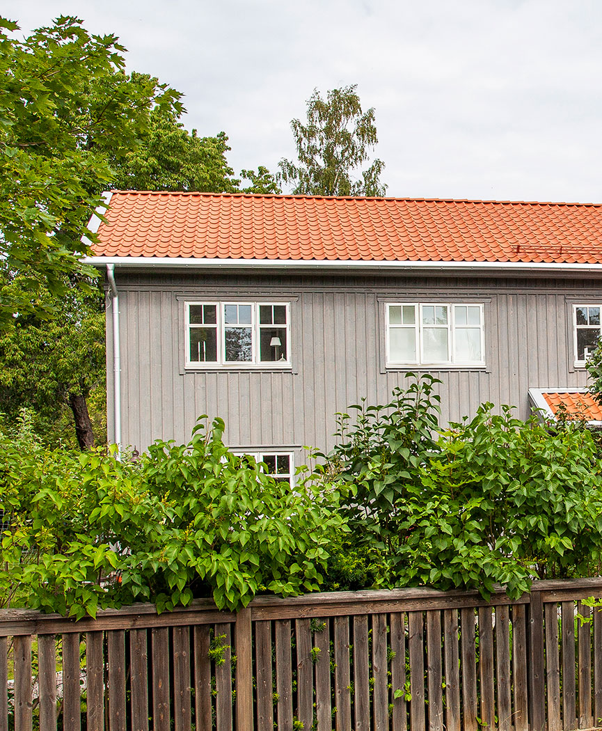 Among tree roses and green plantings, the roof tiles on this wooden villa gives that classical and cosy house-style known throughout Sweden. Only here the natural vibes mostly found in rural Sweden are in a suburb to Stockholm.